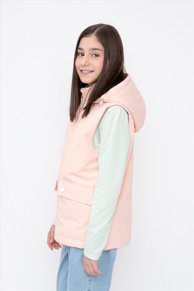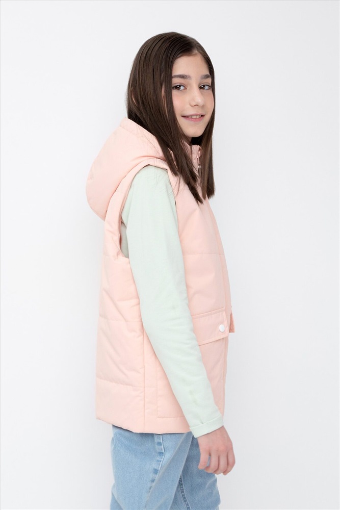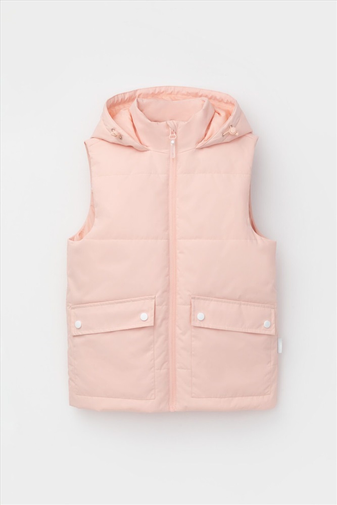 Стеганный жилет с капюшоном для девочки с утеплителем Fellex®: 120 г/м2. Выполнен из мембранной ткани с дополнительной тефлоновой обработкой и матовым покрытием. Данный вид обработки предохраняет изделие от загрязнения и лучше отводит влагу. Подклад из 100% полиэстра. У изделия предусмотрена защита подбородка. Накладные карманы с клапанами на кнопках. Во всех изделиях верхнего ассортимента для безопасности ребенка предусмотрены светоотражающие элементы.