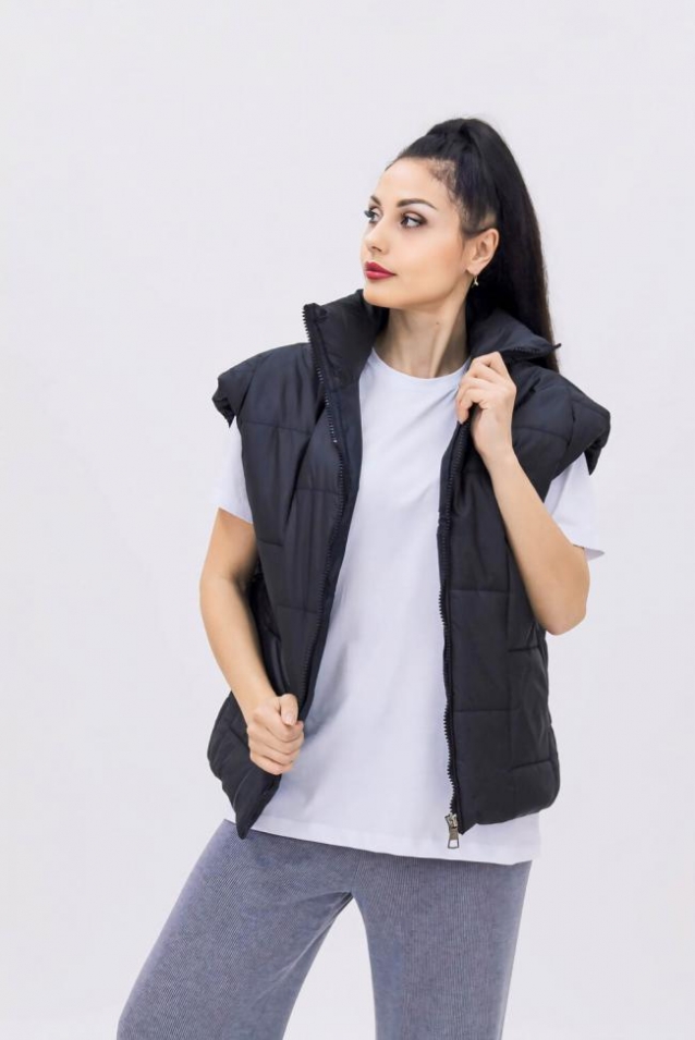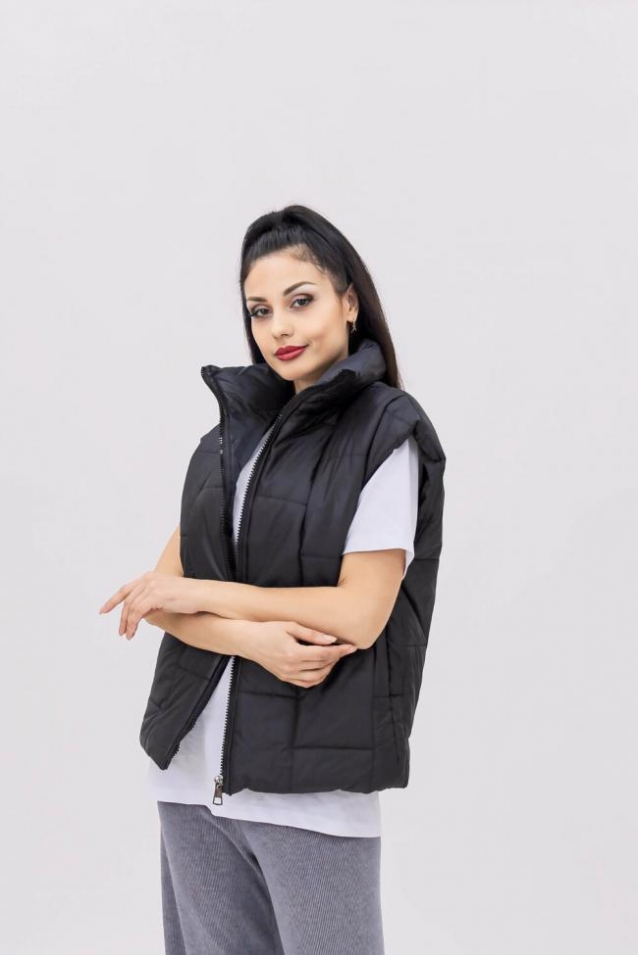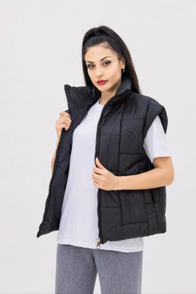 Жилетка с широкими плечами и стильной стежкой в виде квадратов идеальна для тех, кто хочет сохранить тепло и комфорт в прохладные дни и при этом выглядеть актуально и современно. Безрукавка выполнена из качественной матовой ткани с утеплителем, которые гарантируют защиту от холода. Модель имеет удобный крой, который обеспечивает свободу движений и позволяют чувствовать себя комфортно в любой ситуации. Универсальная весенняя верхняя одежда легко сочетается с любыми предметами современного гардероба, поможет создать модные, стильные образы.