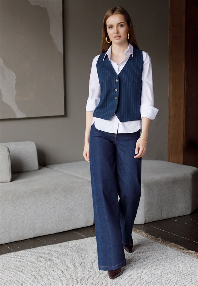 Жилет выполнен из костюмной ткани в полоску. Модель хорошо сидит по фигуре при этом не сковывает движений и подходит для любого типа фигуры. Можно носить как первый слой на тело или поверх футболки. Сочетается в костюме с брюками D24.252 и шортами D28.053