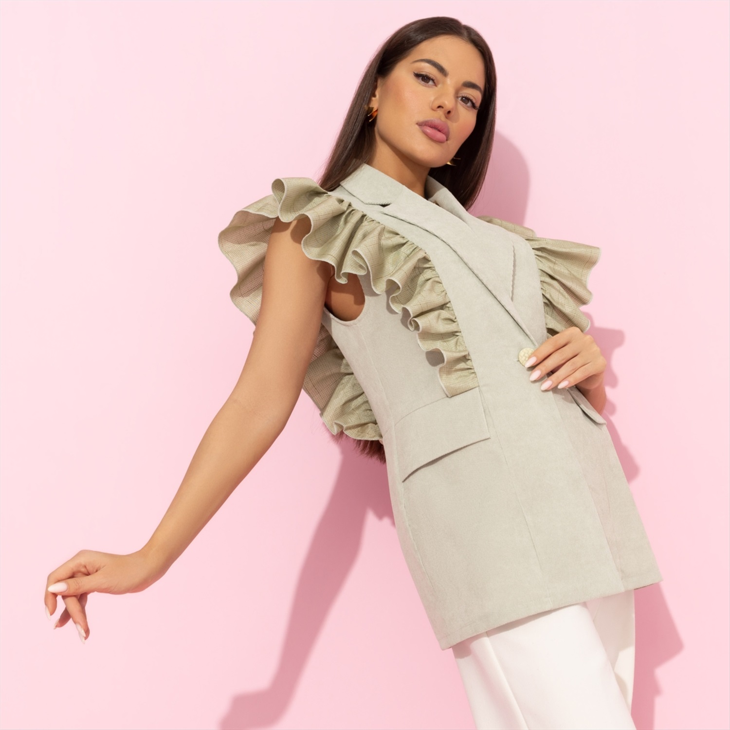 Керри Бредшоу предпочитала хранить деньги там, где их видно – в своем шкафу. Такая финансовая грамотность нам подходит. Сделайте вклад в виде жилета CHARUTTI. Беспрецедентная по выгоде сделка! Жакет однобортный с лацканами без рукавов. Имитация карманов. Симметричный объемный декор в виде рюш на передней и задней стороне изделия.