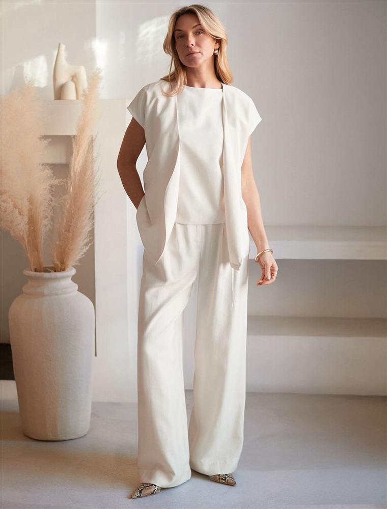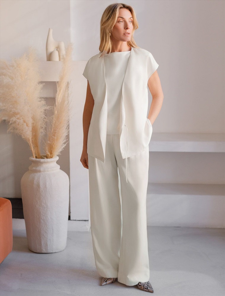 Состав: 92%Лиоцелл (Вис) 8%ПЭ; Плотность: 180 Г/м2 Жилет натурального белого цвета выполнен из плотного лиоцелла. Лиоцелл это более дорогой и экологичный вариант вискозы, очень прочный и шелковистый. Ткань отличается от регулярной коллекции из лиоцелла - она содержит еще больше лиоцелла (92%), благодаря чему имеет более нежную шелковистую фактуру. Стильный фасон и легкий материал делают эту жилетку идеальным вариантом для весны и лета. Пояс мягко акцентирует талию, красиво облегает силуэт и корректирует пропорции, а V-вырез изящно подчеркивает линию шеи. Жилет можно носить без пояса, создавая расслабленный образ. Спущенная линия плеча позволяет использовать жилет, где требуется деловой дресс-код. Благодаря продуманному крою жилетка сидит идеально на разных фигурах, в том числе и на больших размерах..Такой жилет помогает создать актуальный и функциональный летний гардероб: он превосходно сочетается с разными низами, мгновенно преображая любой аутфит. Рекомендуем сочетать с артикулами: D26.208, D24.313