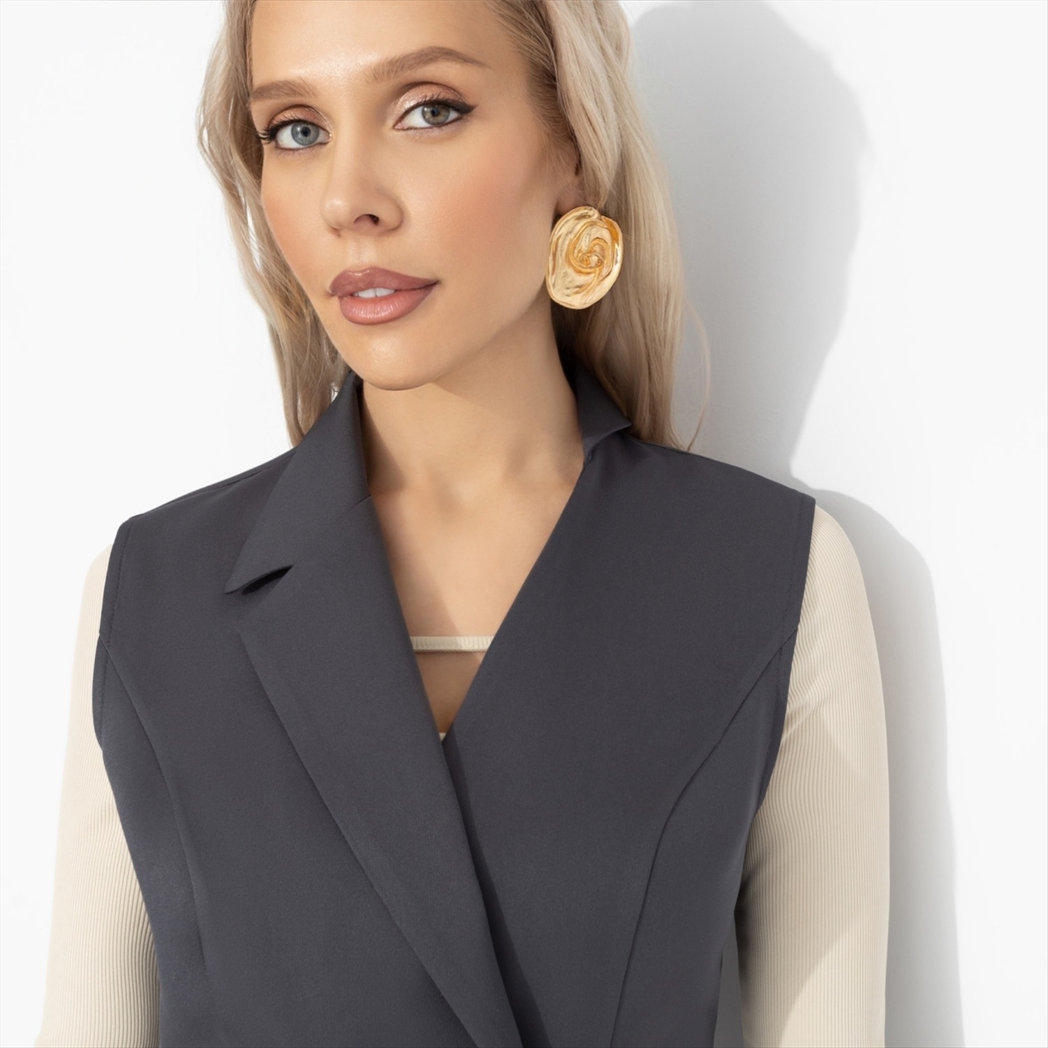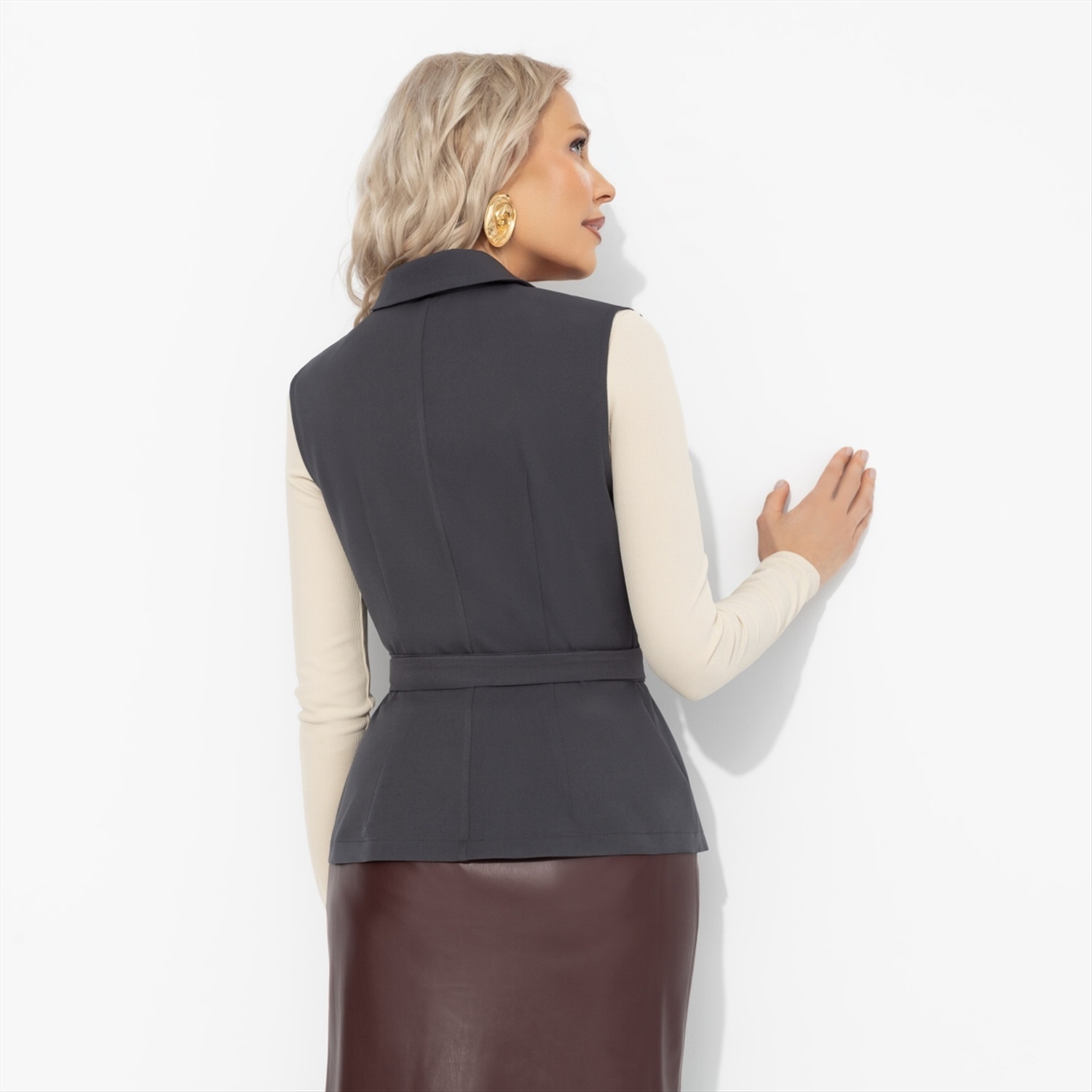 Иди к целям уверенно и со вкусом! В этом жилете легко провести важную встречу, получить одобрение совета директоров – и свою заслуженную премию. Элегантный, собранный, но с мягким намёком на женственность. Жилет с поясом, подчёркивающим талию, и английским воротником. Лаконичный крой делает модель универсальной – для офиса, переговоров и светских встреч. Жилет приталенного силуэта с асимметричным акцентным воротником.