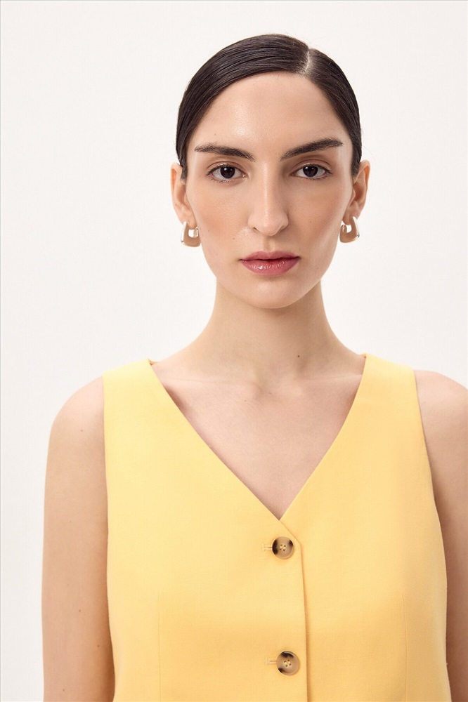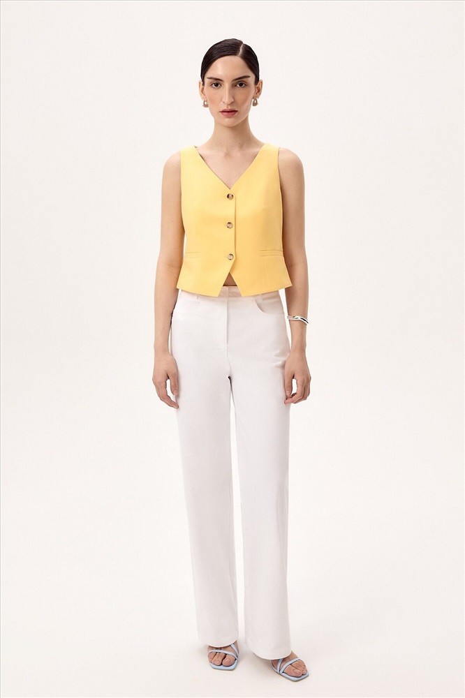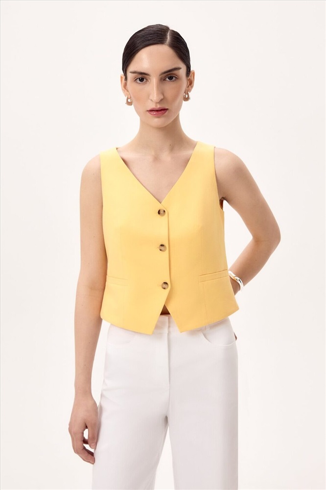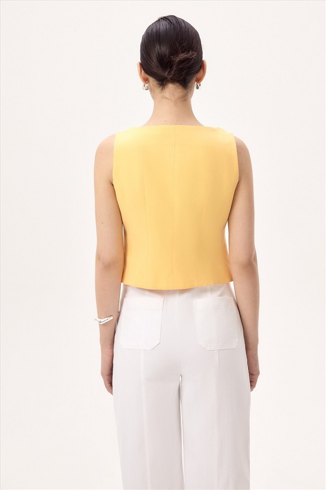 ID товара: 1136694 Состав: Основная ткань- Хлопок 90%, Лен 10%; Подкладка- Хлопок 100% Сезон: Весна/Лето Длина: Укороченная Фасон: Приталенный Рукав: Без рукавов Вид застежки: Пуговицы Вырез горловины: V-образный Тип карманов: Прорезные Основная ткань: Хлопок Стиль: классический Страна бренда: Россия Страна производства: Россия Укороченный жилет прилегающего силуэта из смесовой костюмной ткани солнечно - желтого цвета с V-образным вырезом, прорезные карманы листочки на 3-х пуговицах. Идеальное решение для летнего костюма с брюками из одной ткани. Комментарии к товару