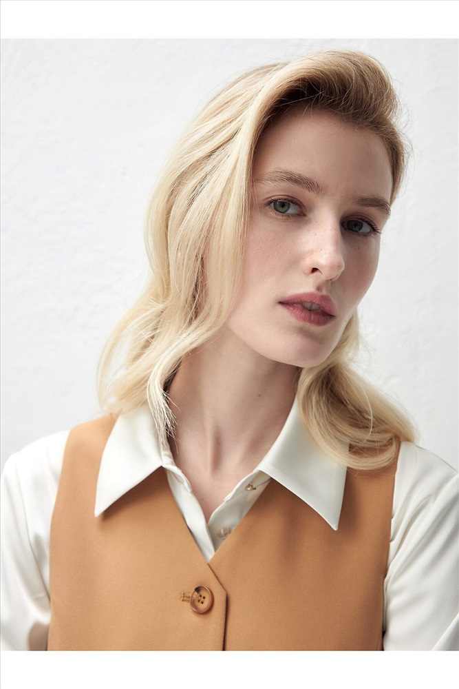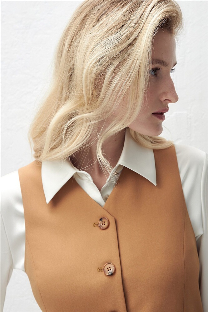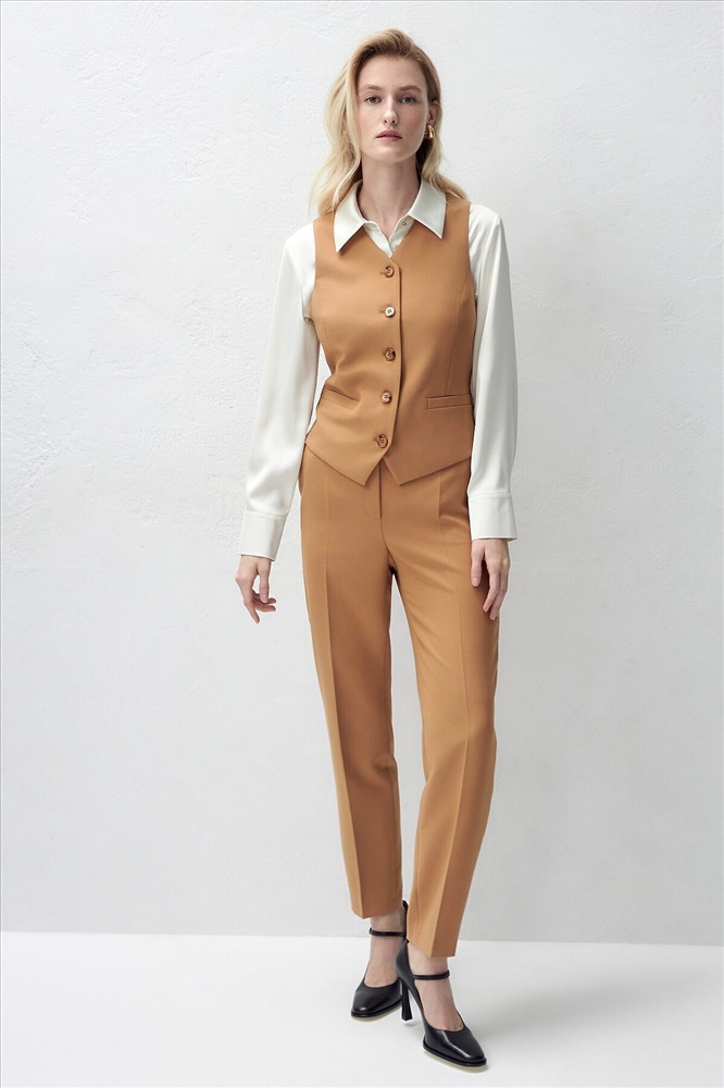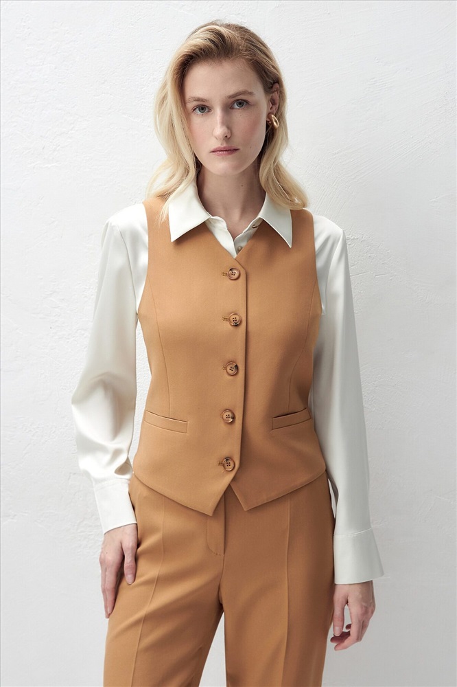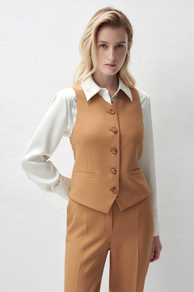 Жилет на подкладке полуприлегающего силуэта с фигурным низом из костюмной ткани с V-образным вырезом, застежкой на пуговицы и прорезными карманами листочками. Модель идеально сочетается с брюками из этой же ткани.