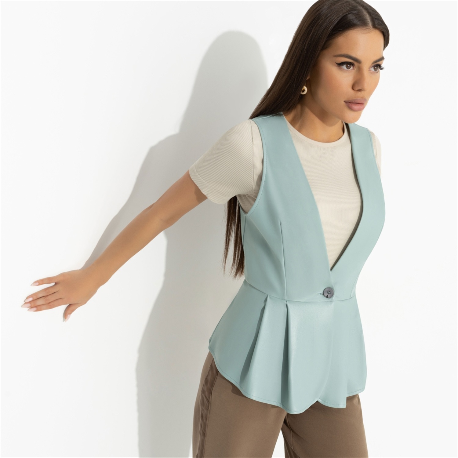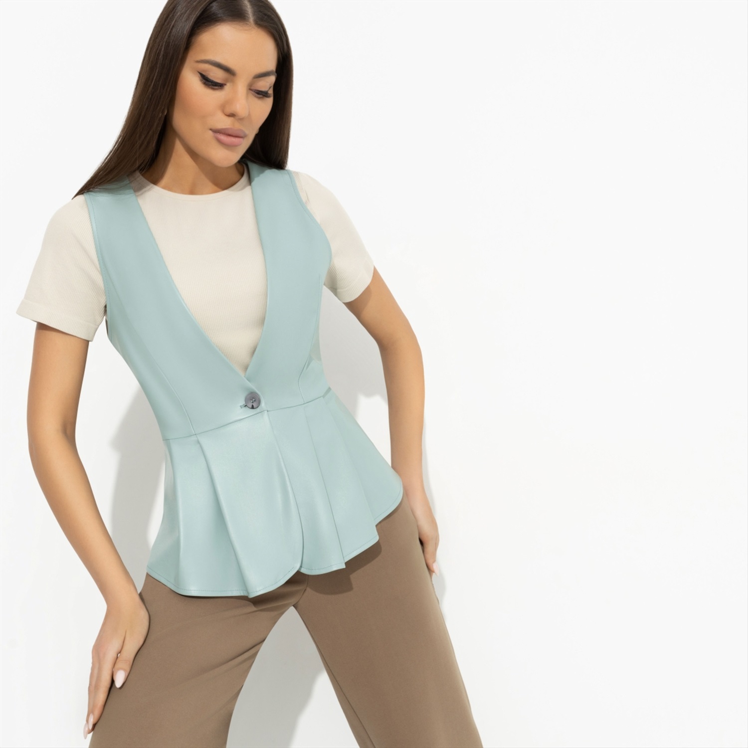 Жилет, который ощущается как исполнившаяся мечта. Тихая или громкая радость, поддержка близких и мурашки по коже – все это идет в комплекте к жилету CHARUTTI. Жилет из экокожи приталенного силуэта. Асимметричный подол изделия. Жилет застегивается на пуговицу. Легкая баска по спинке изделия. Комментарии к товару