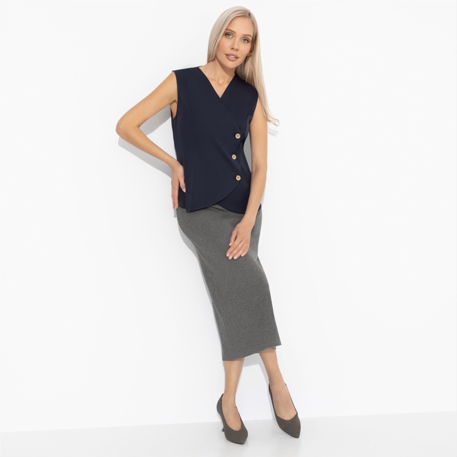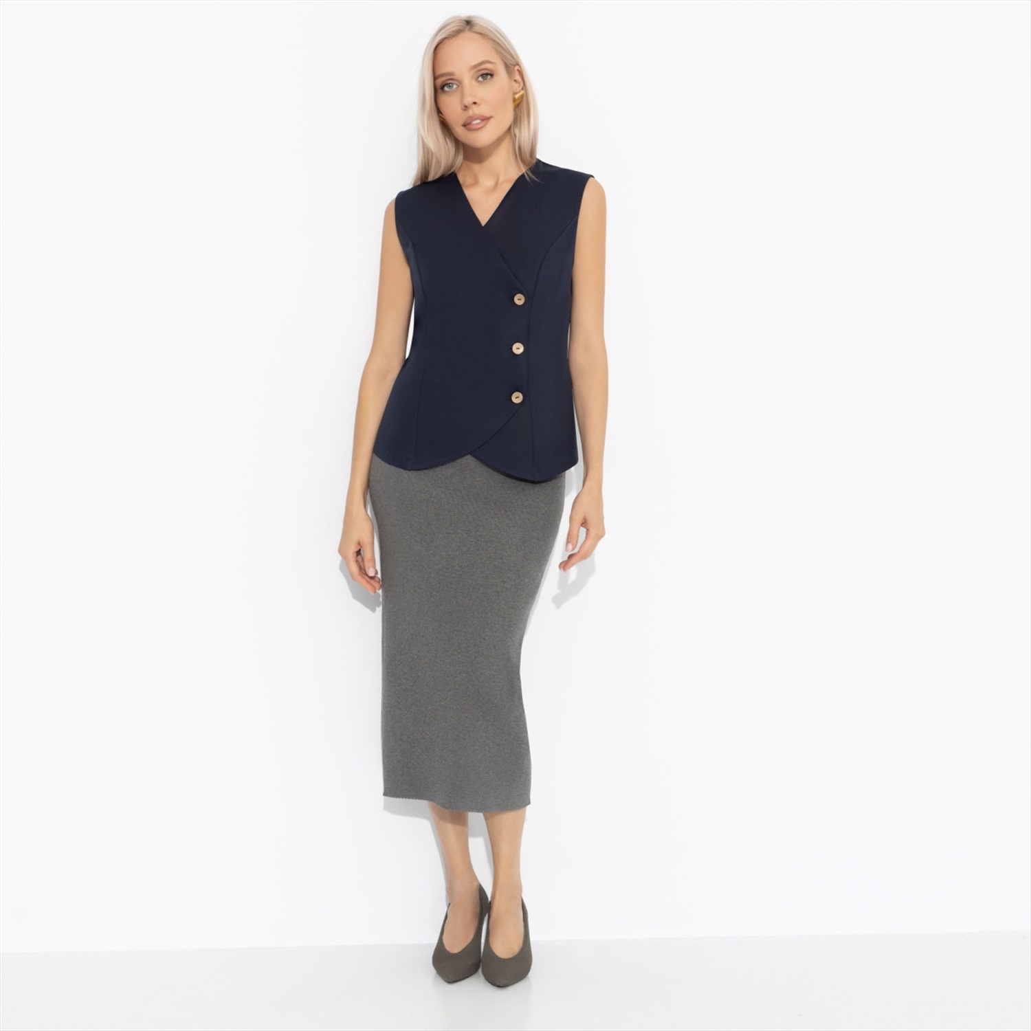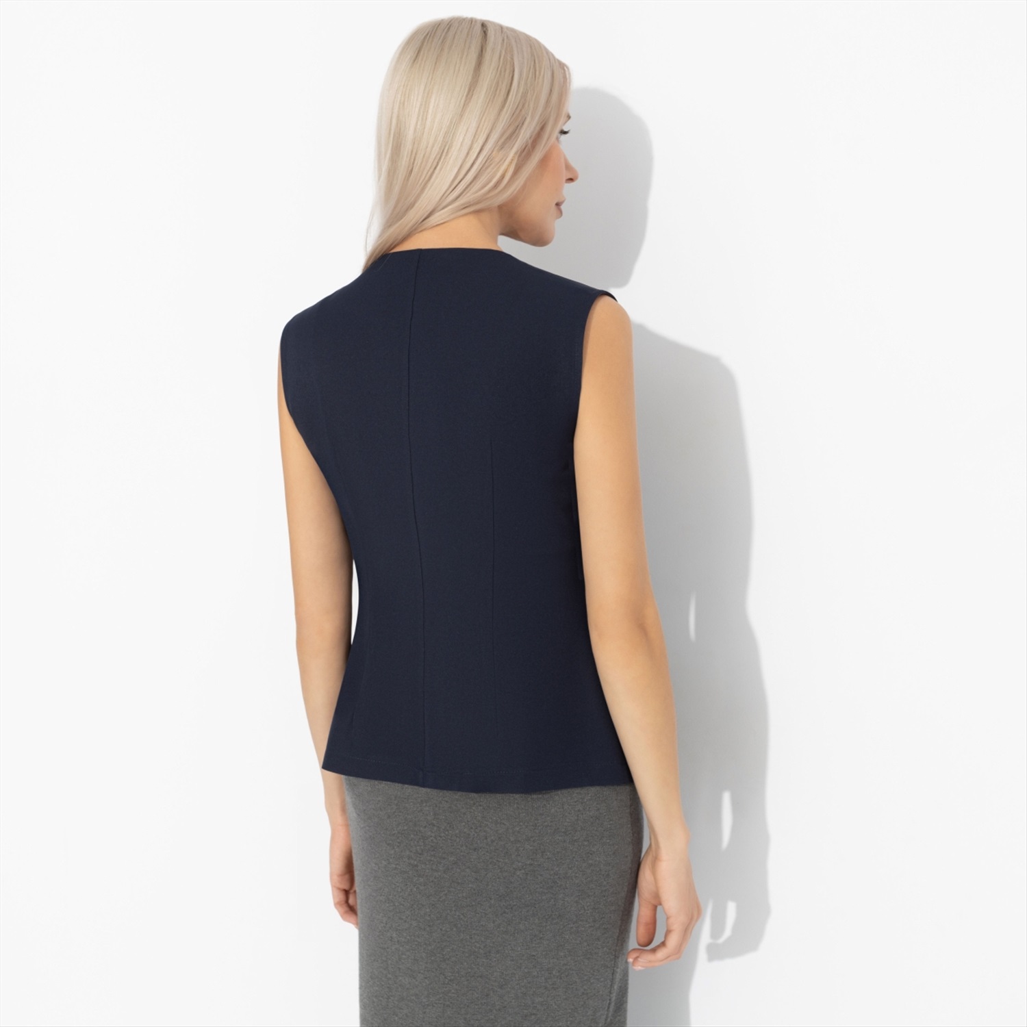 Жилет ЧАРУТТИ говорит о творческом подходе к деловому стилю. Асимметричные пуговицы добавляют современный и смелый акцент, нарушая традиционные правила офисного дресс-кода. Надень его поверх шелковой блузы, чтобы подчеркнуть талию и создать образ элегантной загадочности. Он идеально дополнит как классические брюки для встречи, так и юбку-миди для романтического ужина. Жилет в деловом стиле. Изделие приталенного силуэта укороченное. Асимметричное расположение пуговиц изделия.