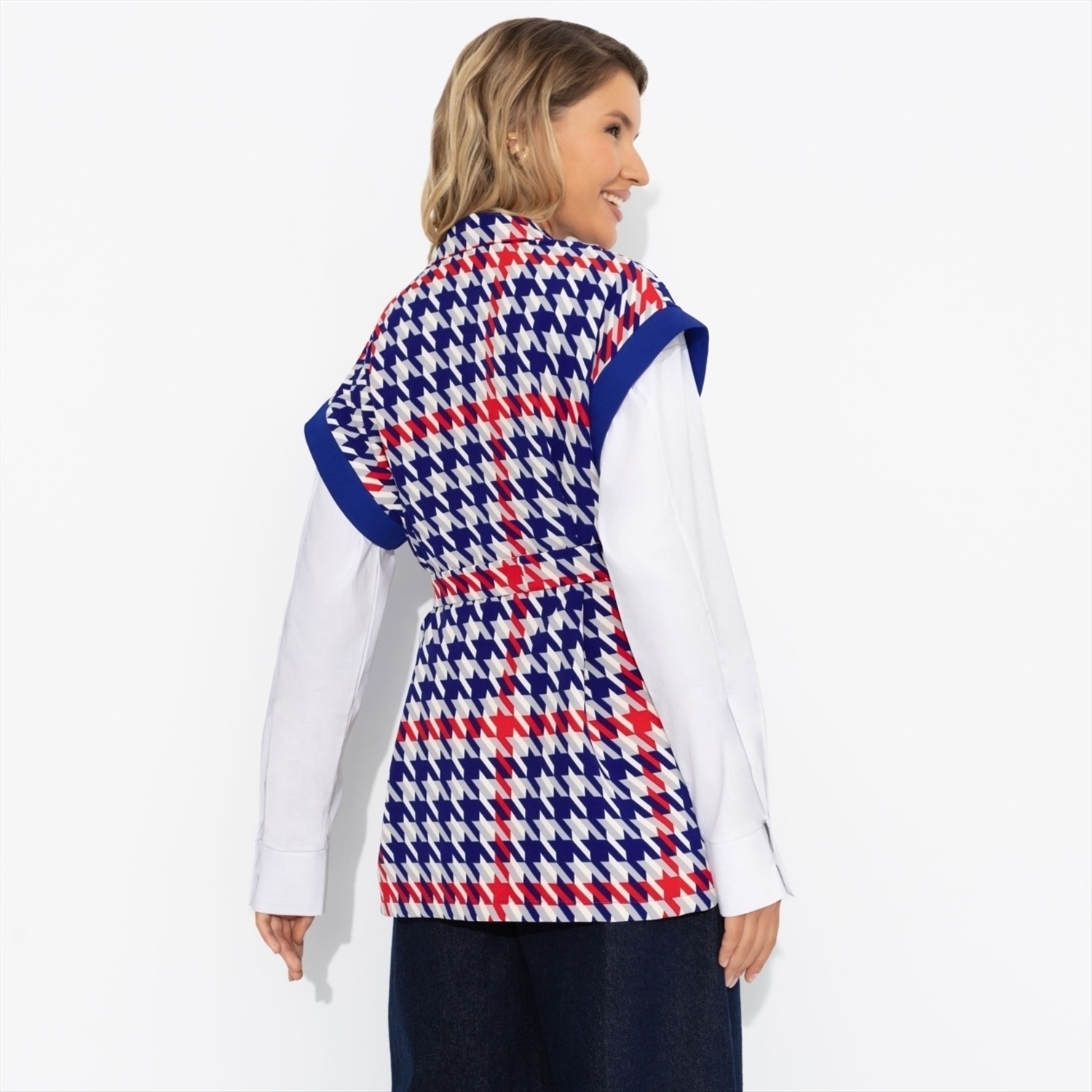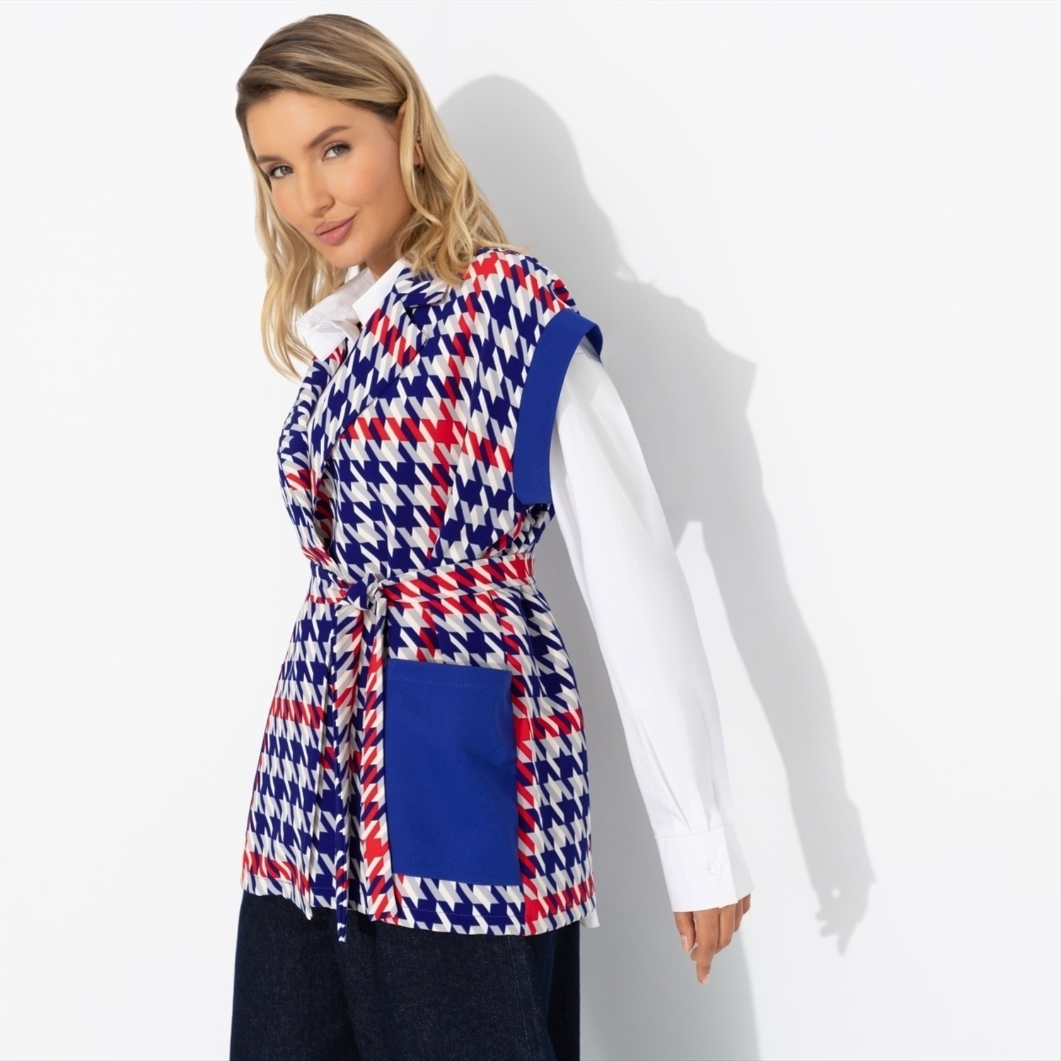 Вы встретились с подругами на обед. Жилет ЧАРУТТИ сразу стал темой для разговора за столиком в кафе. Ты надела его поверх простой футболки и вывела свой образ в топ. Подруги наперебой спрашивали, где ты приобрела такую модную вещь, а ты лишь загадочно улыбалась. Жилет прямого силуэта с лацканами. Свободный крой. Объемные карманы контрастного цвета по передней части изделия. Удлиненная линия плеча. Отвороты по окантовке плеча прошиты. Есть пояс в тон основного материала изделия.