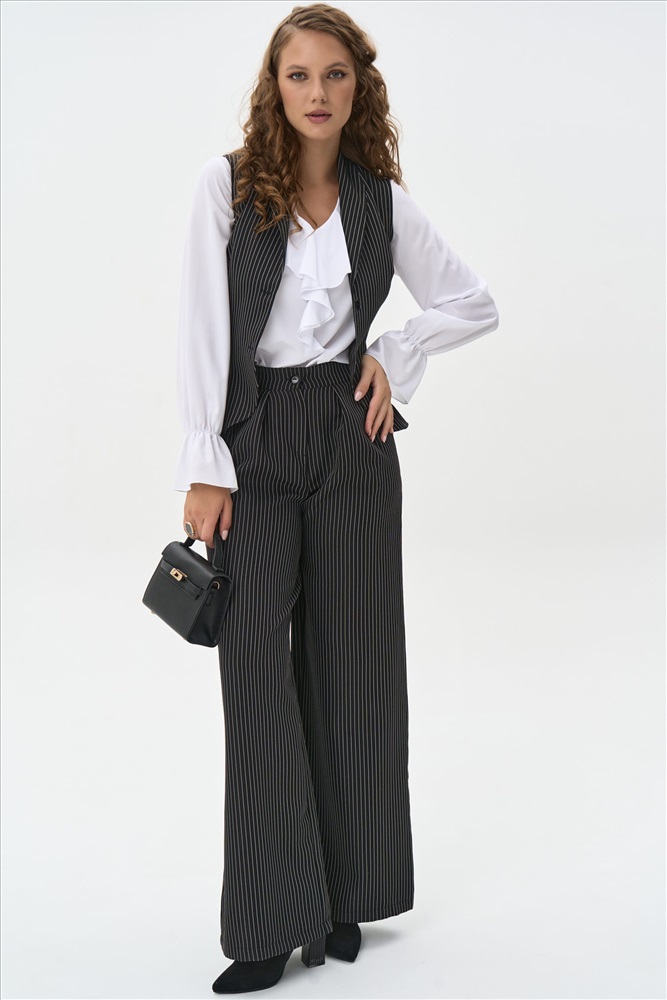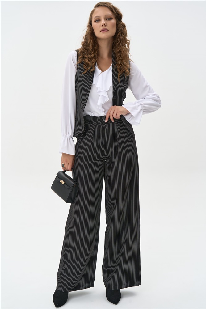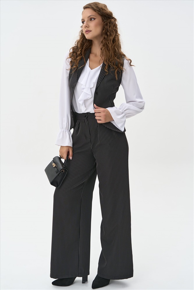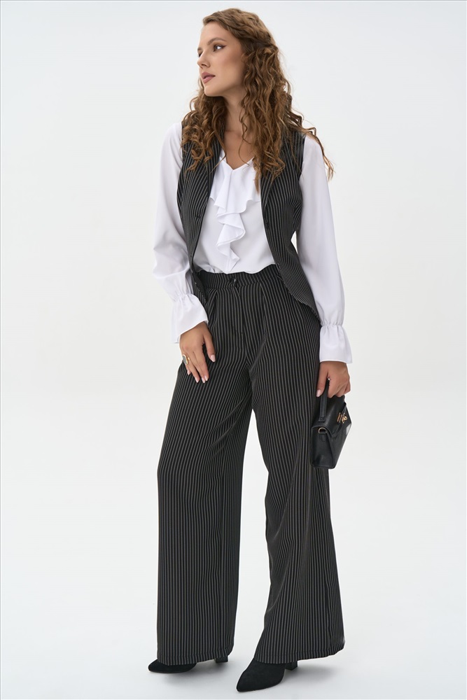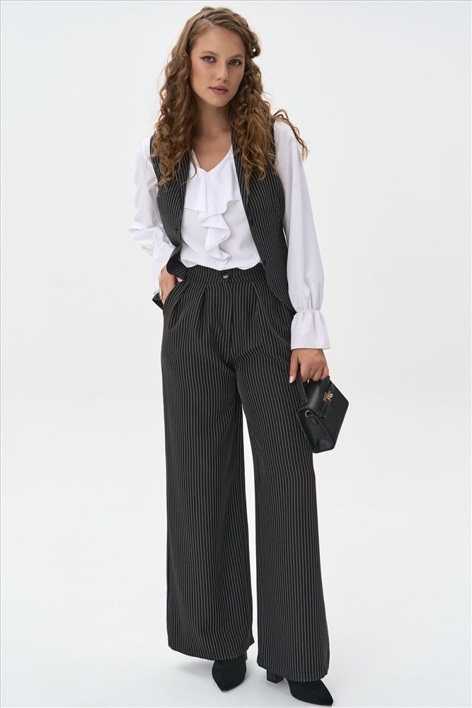 Жилет классического силуэта без рукавов, выполненный из ткани в тонкую вертикальную полоску. V-образный вырез и аккуратный ряд пуговиц создают сдержанный и элегантный образ. Приталенный крой подчёркивает фигуру, а строгий рисунок добавляет графичности.