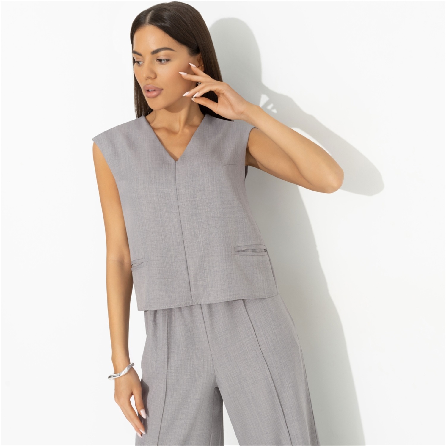 Состав: Костюмная ткань «лерисс» (100% полиэстер) Плотность ткани: Средняя Тип ткани: Текстиль Вид застежки: Нет Декоративные элементы: Другое Карманы: Прорезные Основной цвет ткани: Серый Отрезная талия: Нет Подклад: Нет Резинка по талии: Нет Рисунок/раппорт: Нет, все изделия идентичны Сезон: Круглогодичный Силуэт: Прямой Стиль: Деловой Параметры модели на фото: