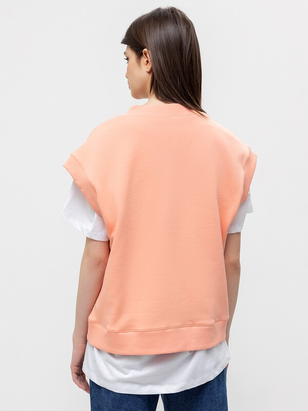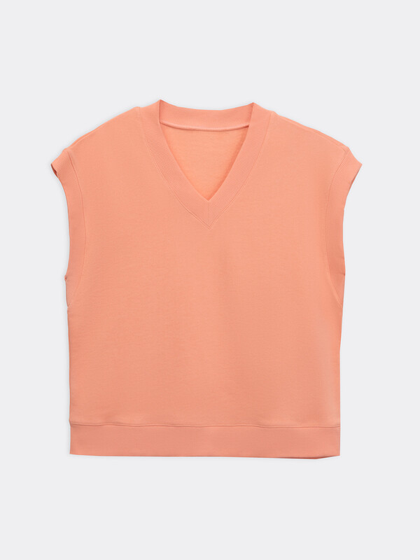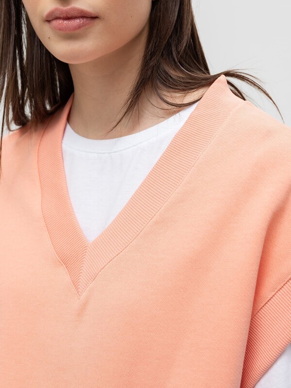 Жилет оверсайз из футера с начесом со спущенным плечом и V-образной горловиной, длиной до линии бедер.