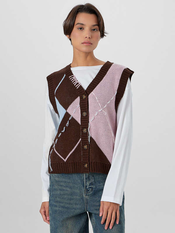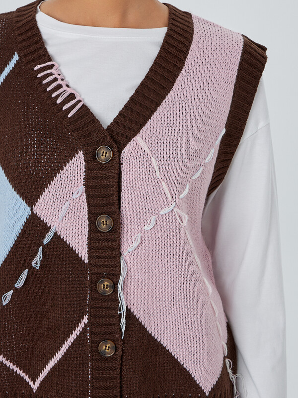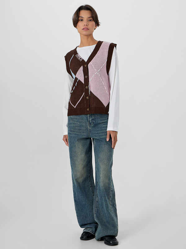 Женский жилет с V-образным вырезом станет универсальным элементом вашего гардероба. Модель на пуговицах позволяет создавать многослойные комплекты для прохладной погоды. Декоративные швы добавляют фактурности, создавая эффект ручной работы и подчеркивая внимание к деталям.