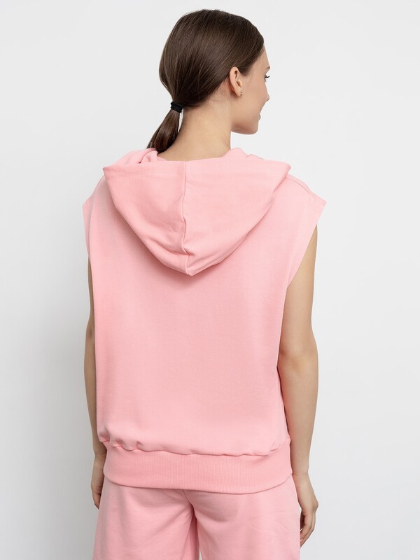 Стильная жилетка из легкого трикотажного футера. Силуэт модели прямой и свободный. Есть просторный уютный капюшон. Спущенная линия плеча дарит особый комфорт. Изюминкой модели является вместительный карман-кенгуру. По нижнему краю проходит широкий пояс из рибаны. Стильный жилет для комфортных городских образов!
