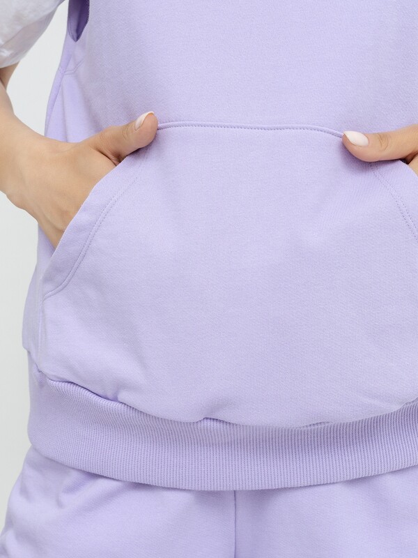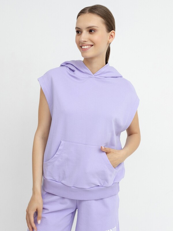 Стильная жилетка из легкого трикотажного футера. Силуэт модели прямой и свободный. Есть просторный уютный капюшон. Спущенная линия плеча дарит особый комфорт. Изюминкой модели является вместительный карман-кенгуру. По нижнему краю проходит широкий пояс из рибаны. Стильный жилет для комфортных городских образов!