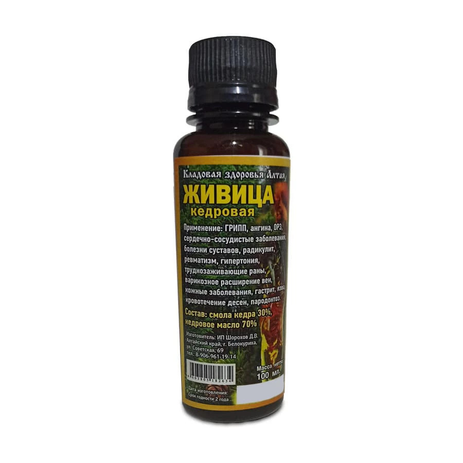 Кедровой живицей лечат хронические язвы, гастриты, пародонтоз, кровоточивость дёсен, неприятный запах из рта, фурункулы, простудные заболевания, грипп, ангина, кашель, бронхит, ларингит, туберкулёз, астма бронхиальная.