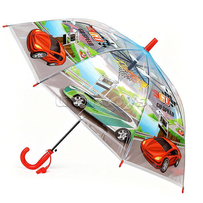 Размер: 65 см Яркий детский зонт трость - это необходимый аксессуар для каждого ребенка Механизм полуавтомат, открывается с кнопки в одно движение, закрывается вручную Со свистком Материал: металл, пластика Для детей от 3-х лет