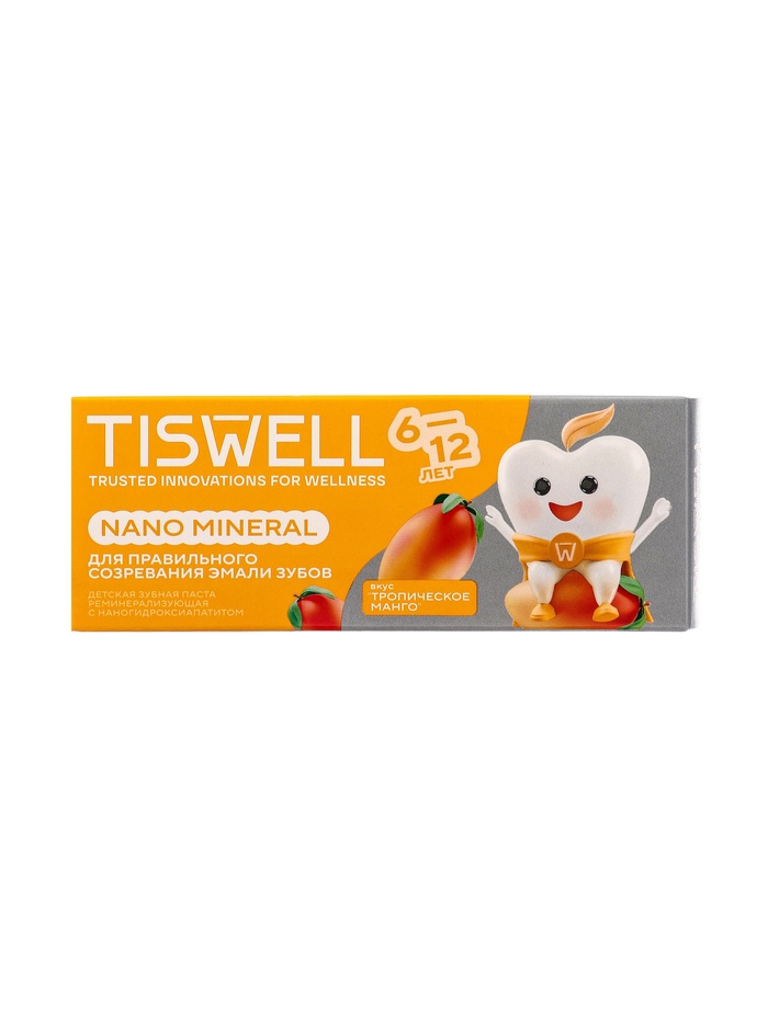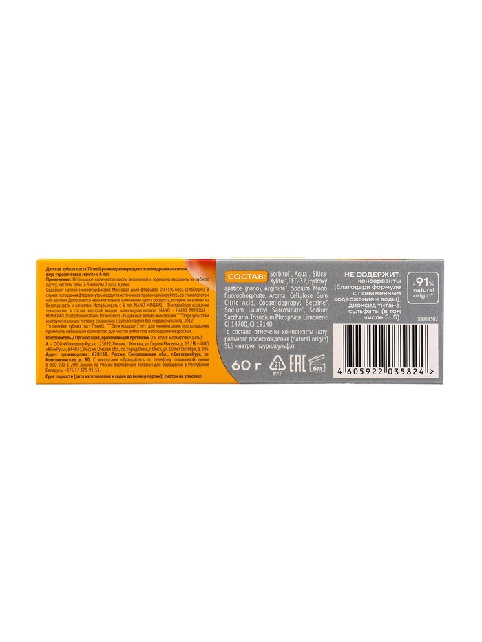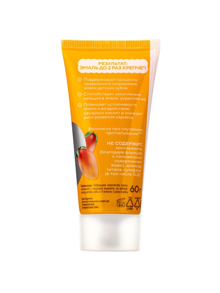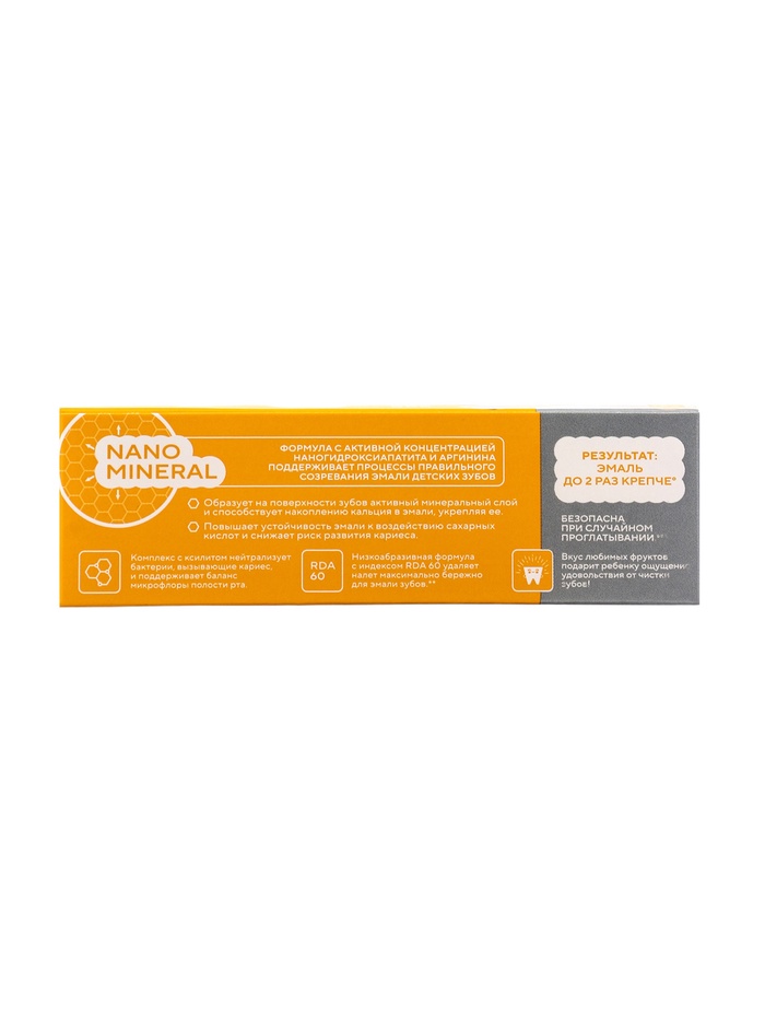 Габариты: 12,5 x 5 x 4 Страна: Россия В боксе: 9 шт Состав: См. на упаковке Материалы: см. на упаковке Фасовка: по 1 шт Индивидуальная упаковка: Без упаковки Сертификат: ЕАС Возраст: От 6 лет Вес, г/Объём, мл: 60 Возраст: Детский С дозатором: Нет Применение: Для ежедневного применения Вес/Объём: 60 г Фиксированная цена: Да Зубная паста детская реминерализирующая с наногидроксиапатитом «Манго», 60 г — специально разработана для детей от 6 до 12 лет, учитывая особенности детской эмали и потребности растущих зубов. Паста обогащена наногидроксиапатитом, который проникает в микротрещины эмали, укрепляет её и помогает предотвращать кариес. Мягкая очищающая формула бережно заботится о зубах и дёснах, не раздражает слизистую полости рта, обеспечивая щадящий и безопасный уход. Сладкий и яркий аромат манго делает чистку зубов увлекательной и приятной, превращая ежедневный ритуал в игру. Паста способствует формированию правильных привычек гигиены у ребёнка, помогая поддерживать здоровье зубов на протяжении всего детского возраста. Способ применения: нанесите небольшое количество пасты на детскую зубную щётку и чистите зубы ребёнка 2 раза в день, утром и вечером, тщательно проходя все поверхности зубов. Контролируйте, чтобы ребёнок не глотал пасту. Рекомендуется использовать под присмотром взрослых для максимальной безопасности и эффективности. Комментарии к товару
