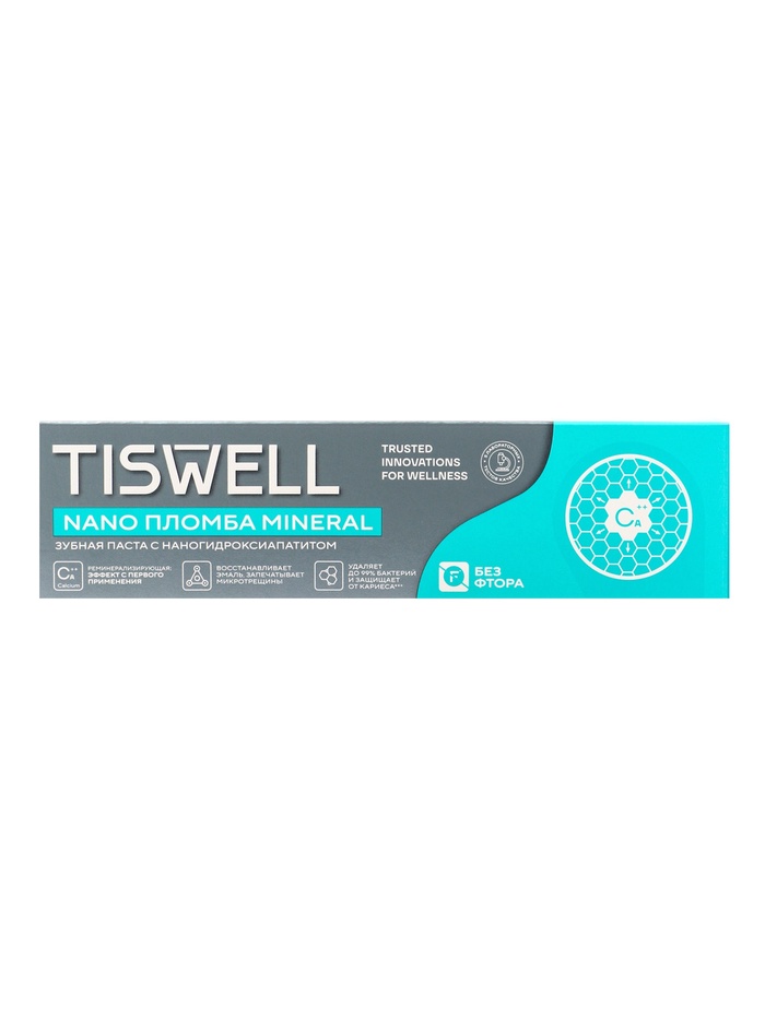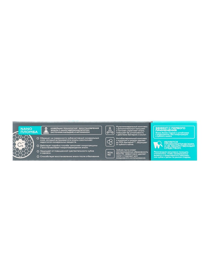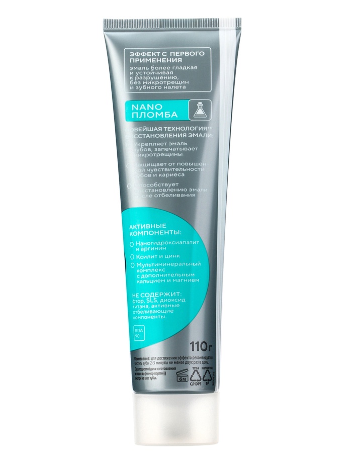 Зубная паста реминерализирующая с наногидроксиапатитом без фтора, 110 г — мягкая и эффективная паста для укрепления зубной эмали и защиты зубов от кариеса. Наногидроксиапатит проникает в микротрещины эмали, восстанавливает её структуру и обеспечивает долговременную защиту, при этом паста не содержит фтора, что делает её безопасной для всей семьи.