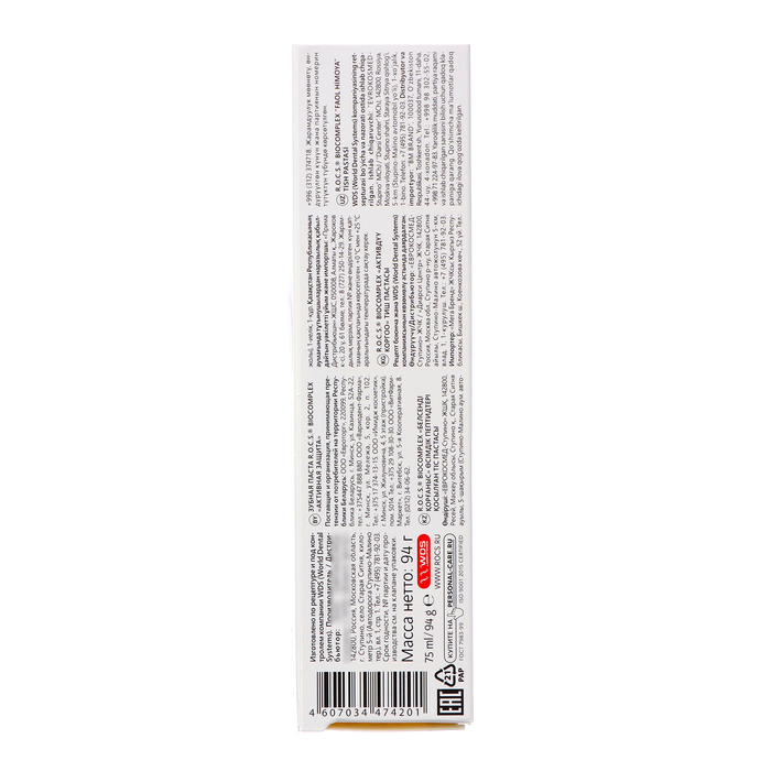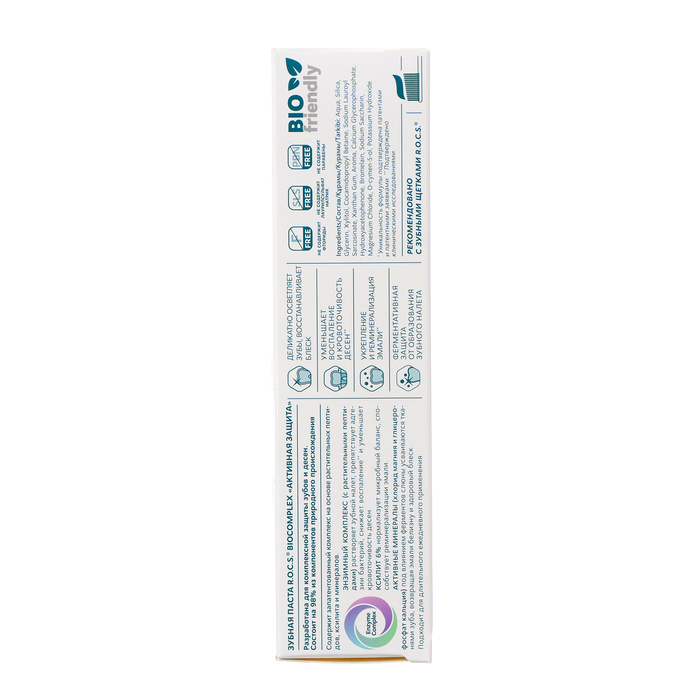 Активные компоненты Энзимный комплекс с растительными пептидами бережно растворяет зубной налёт, препятствует фиксации бактерий на зубах и слизистой рта, уменьшает воспаление и кровоточивость дёсен. Минеральные компоненты (глицерофосфат кальция и хлорид магния) усваиваются зубами под влиянием ферментов слюны и возвращают эмали блеск и белизну. Ксилит (6 %) защищает от бактерий, вызывающих кариес. А так же помогает усвоению кальция и обладает свойствами пробиотика. Обеспечивает высокий уровень комплексной защиты зубов и дёсен за счёт действия биокомпонентов растительного происхождения, активность которых сохраняется благодаря низкотемпературной технологии приготовления зубной пасты. Не содержит фтора, парабенов, лаурилсульфата натрия (SLS), триклозана и хлоргексидина. Доказано клиническими исследованиями. Для более выраженного эффекта рекомендуется сплюнуть излишки зубной пасты, не ополаскивать рот и воздержаться от приёма пищи и напитков в течение 30–40 минут. Состав: Aqua, Silica, Glycerin, Xylitol, Cocamidopropyl Betaine, Sodium Lauroyl Sarcosinate, Xanthan Gum, Aroma, Calcium Glycerophosphate, Hydroxyacetophenone, Bromelain, Sodium Saccharin, Magnesium Chloride, O-cymen-5-ol, Potassium Hydroxide. Комментарии к товару