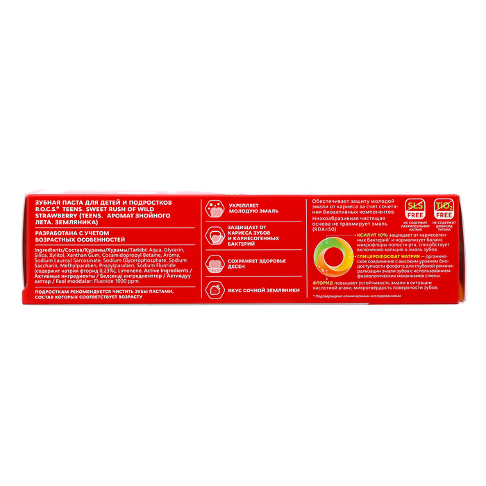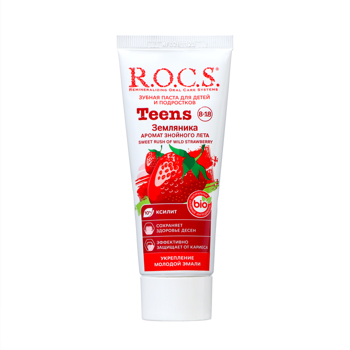 R.O.C.S. для младших школьников и подростков содержит высокоэффективный комплекс AMIFLUOR® - источник ксилита и аминофторида, который обеспечивает быстрое, всего 20 секунд, формирование высокостабильного защитного слоя. Благодаря этому паста R.O.C.S. Teens обладает следующими эффектами: