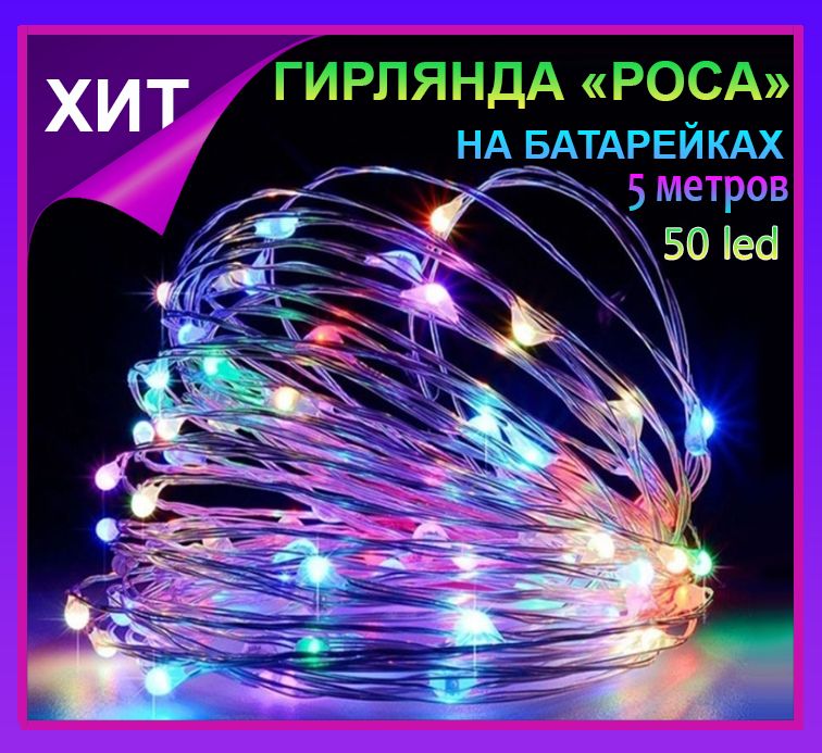Гирлянда нить Светлячки, гирлянда Роса 5 метров,50 led, разноцветное свечение