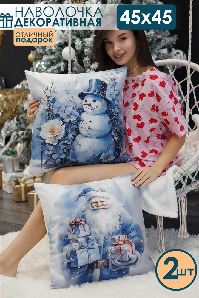 Наволочка декоративная Дед мороз и снеговик синий 2 шт велюр