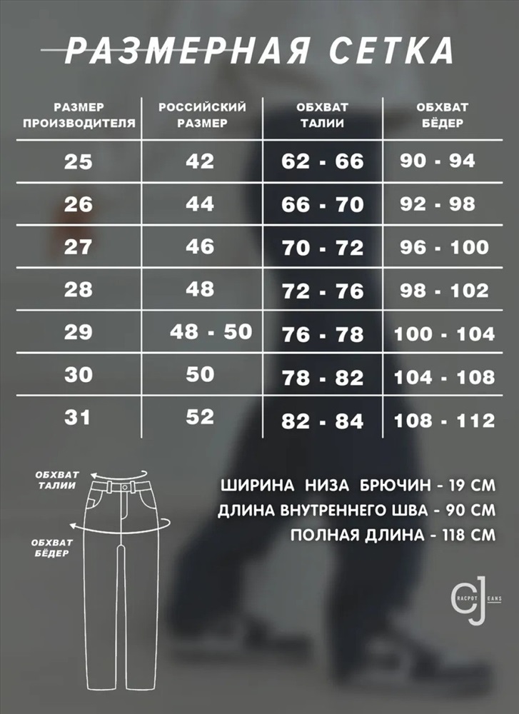 Размер : 25-(42), 26-(44), 27-(44-46), 28-(46), 29-(48), 30-(50), 31-(50-52), 32-(52), 33-(52-54), 34-(54)