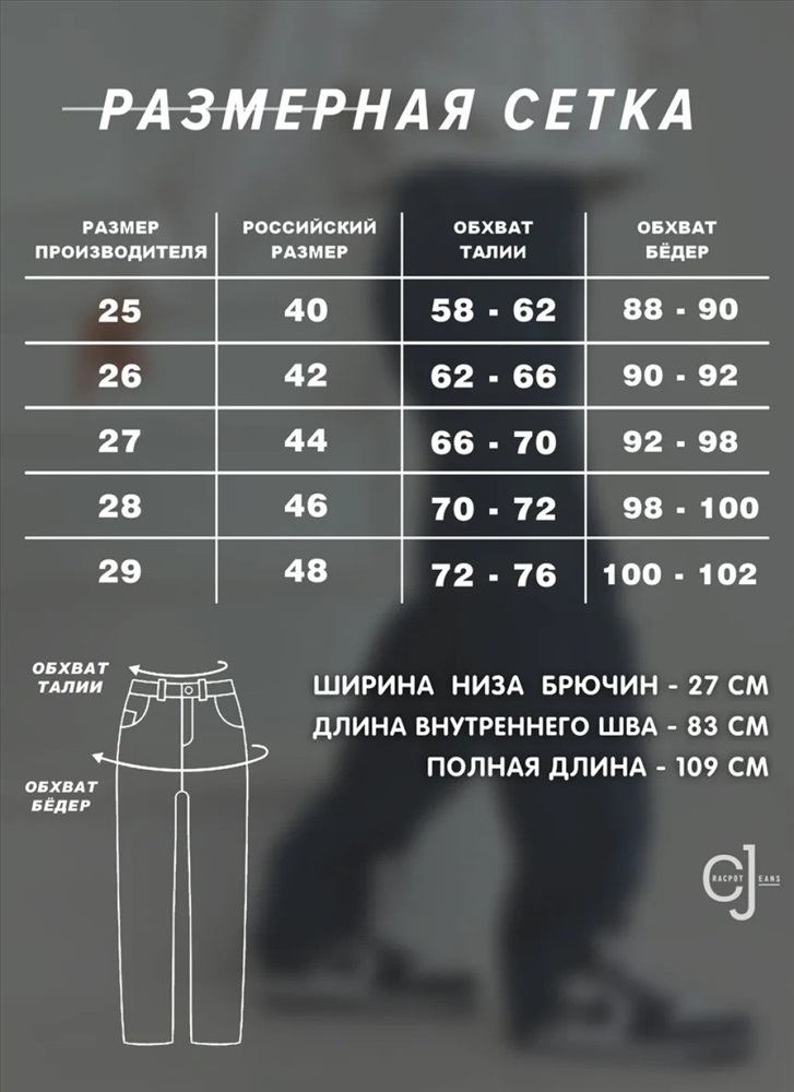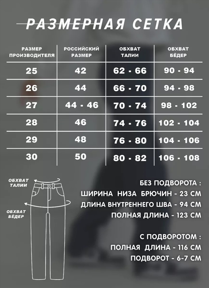Размер : 25-(42), 26-(44), 27-(44-46), 28-(46), 29-(48), 30-(48-50)