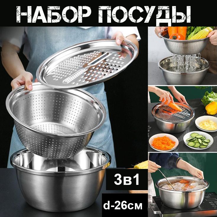 Набор 3в1 терка, ситечко-дуршлаг, чаша d-26см