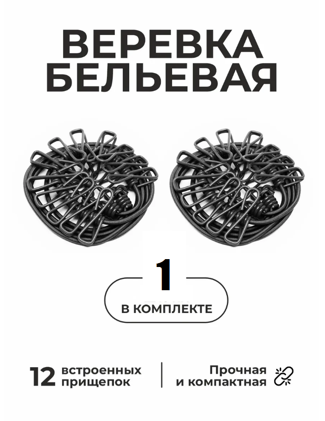 Веревка бельевая черная, 12 прищепок , 1м74см