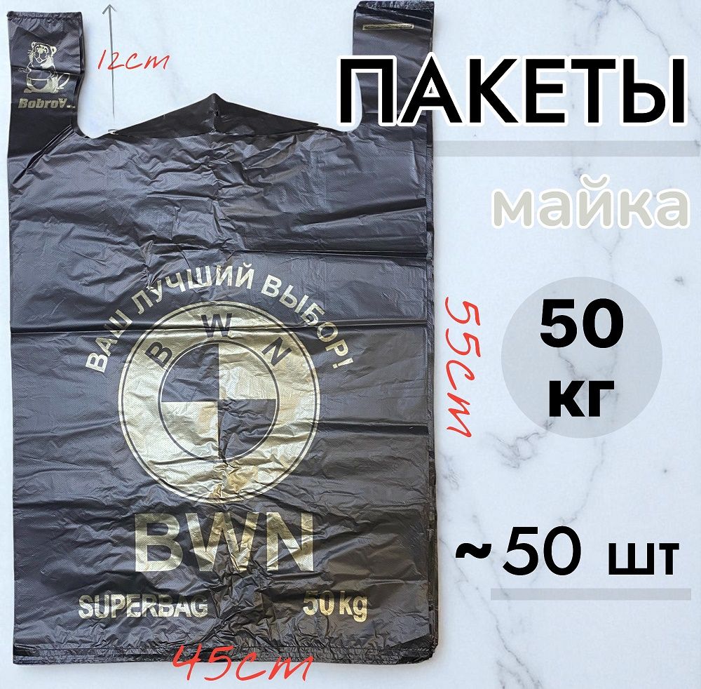 Пакеты майка черные, упаковка 50шт, 58х45см
