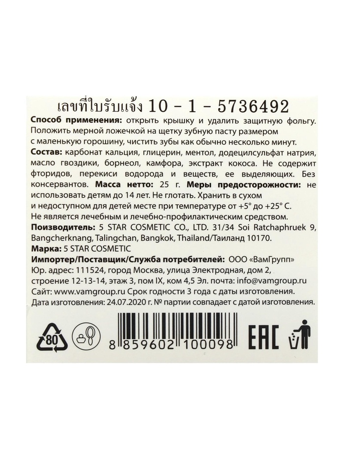 Зубная паста травяная отбеливающая 5 Star Cosmetic, с экстрактом Кокоса, 25 г 7 фото