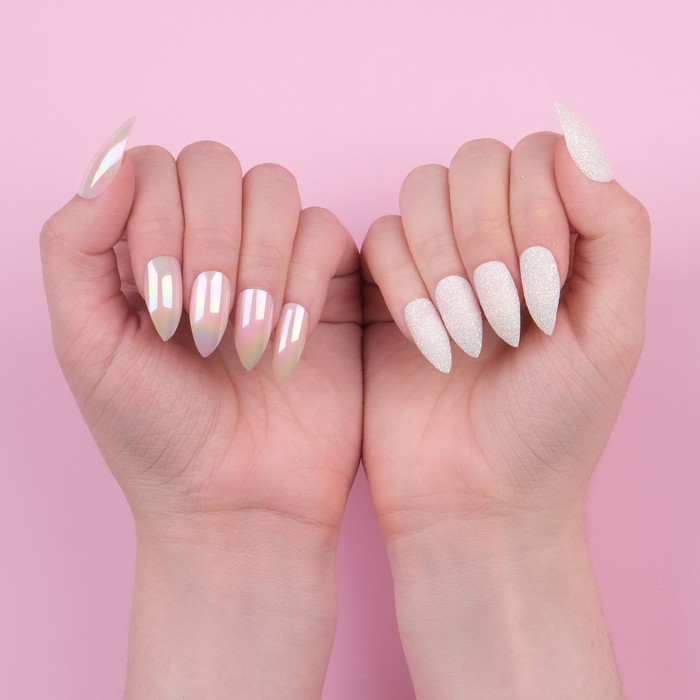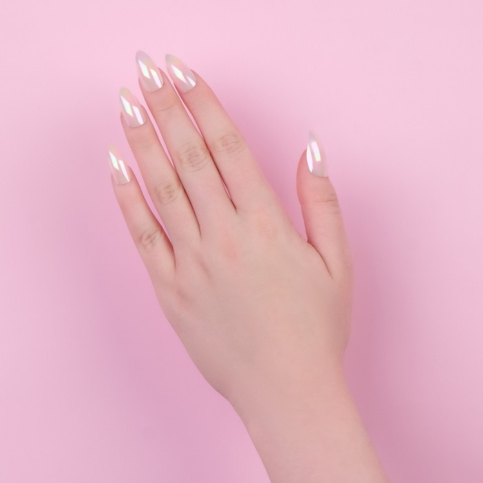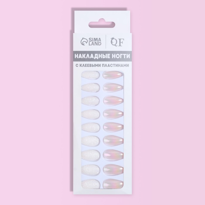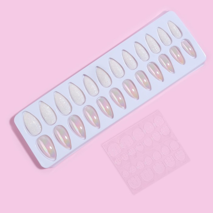 Накладные ногти, 24 шт., с клеевыми пластинами, форма миндаль, с блёстками, голографические, белые 9 фото