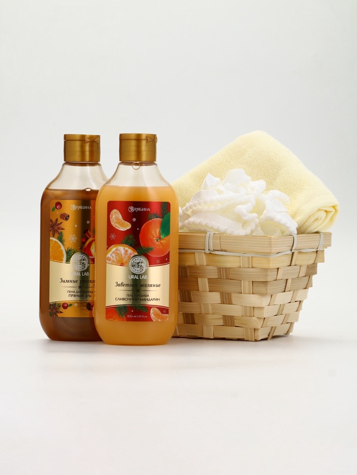 Подарочный набор новогодний в корзине, гель для душа, пена для ванны, мочалка и полотенце, URAL LAB