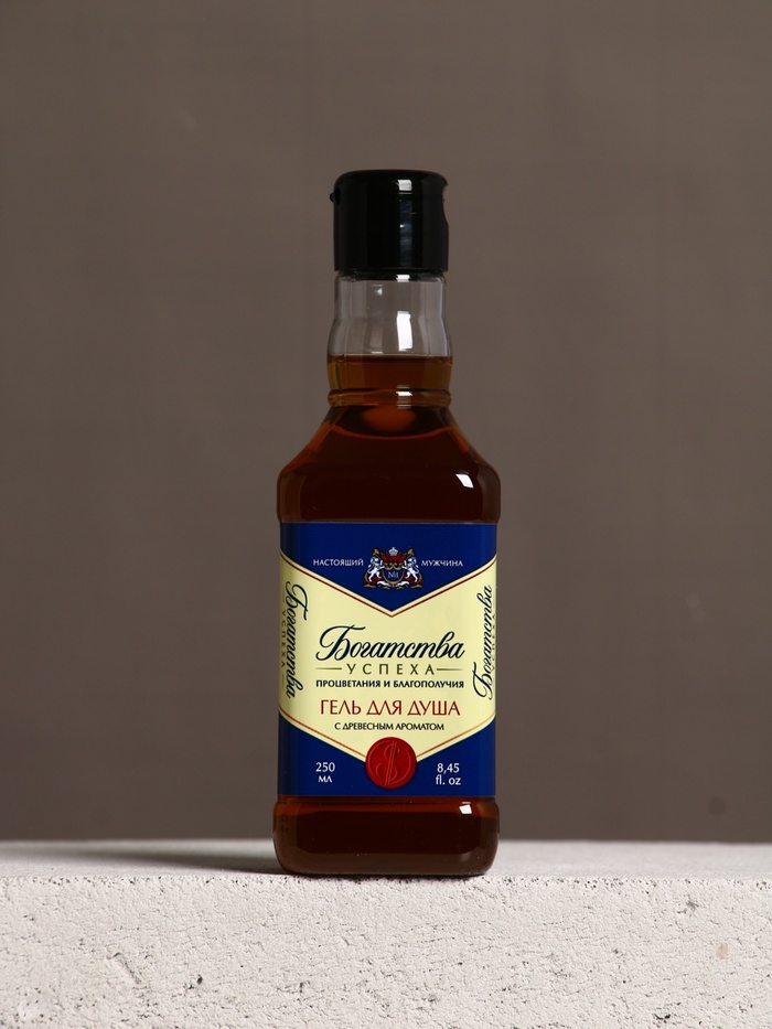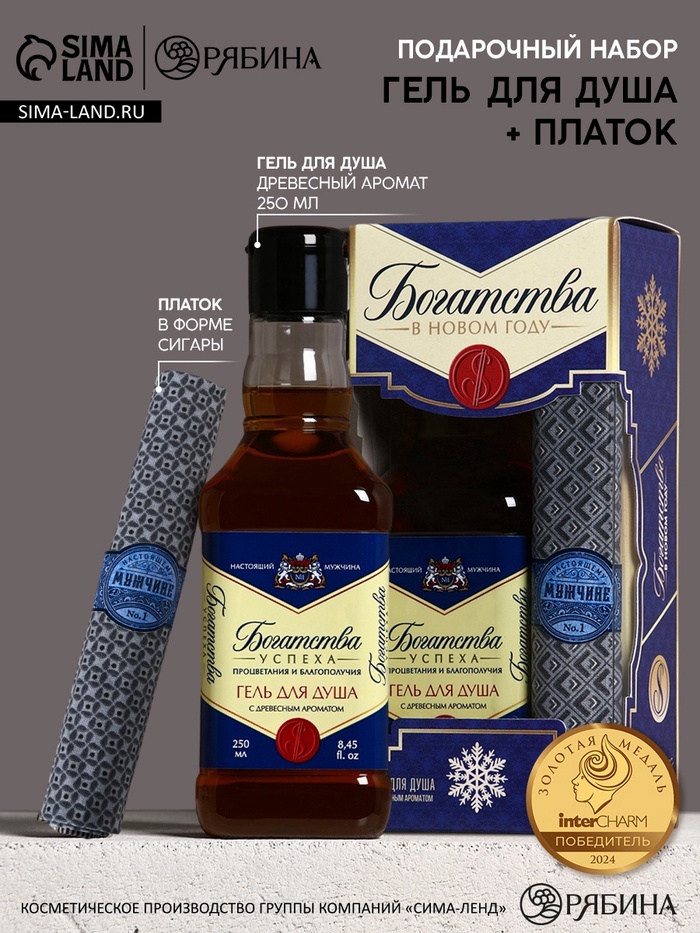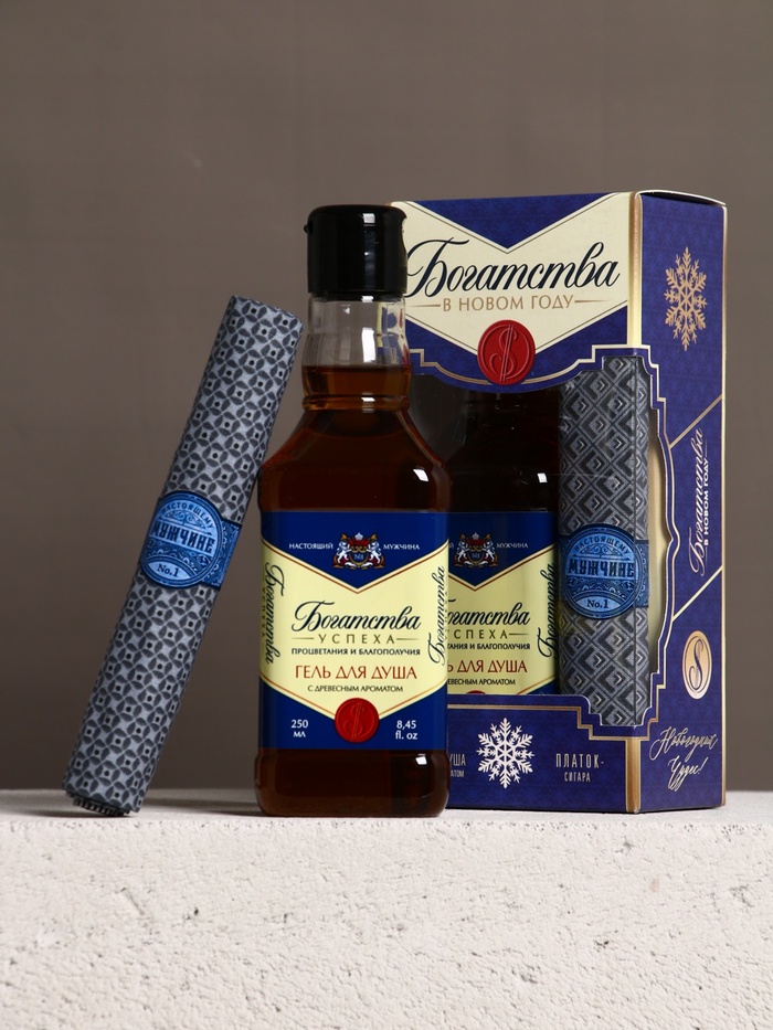 Подарочный набор новогодний «Богатства в Новом году»: гель для душа во флаконе виски, аромат древесный, 250 мл; платок в форме сигары