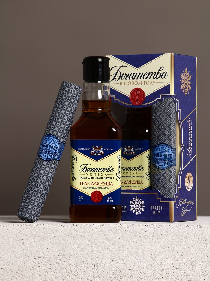 Подарочный набор новогодний «Богатства в Новом году»: гель для душа во флаконе виски, аромат древесный, 250 мл; платок в форме сигары 10 фото