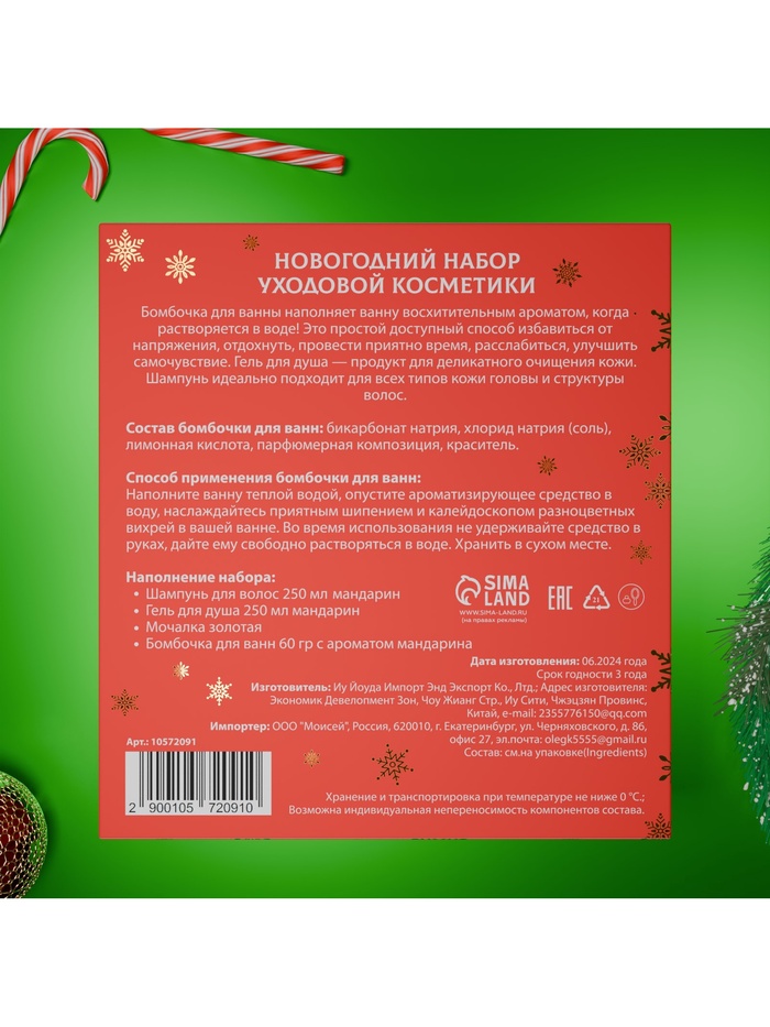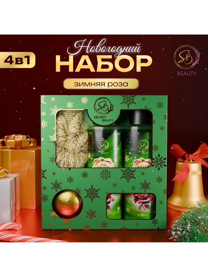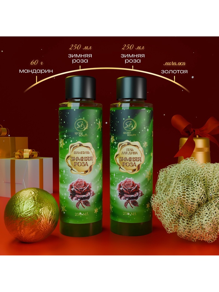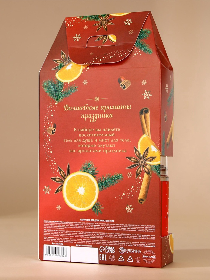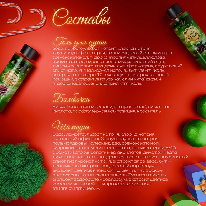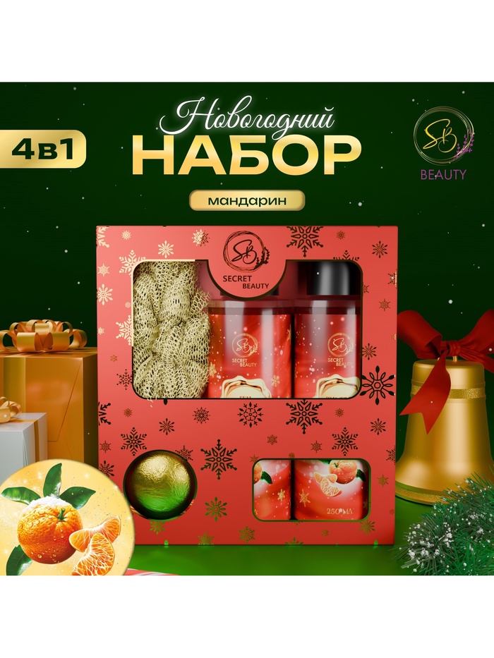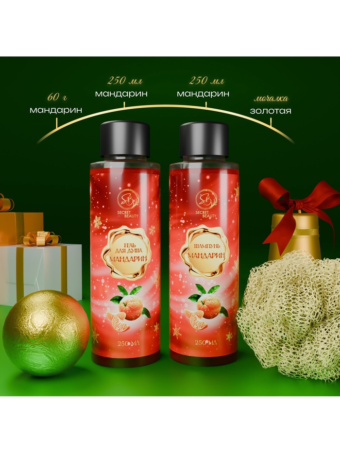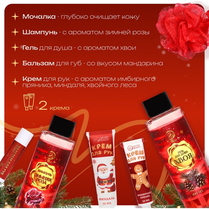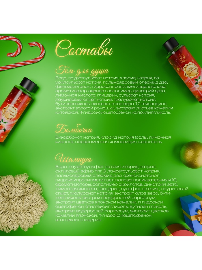 Новогодний подарочный набор косметики SB BEAUTY, гель для душа, шампунь, бомбочка, мочалка, аромат мандарина, корицы и имбирного печенья 5 фото