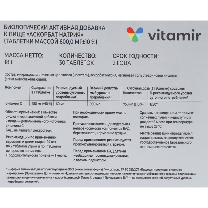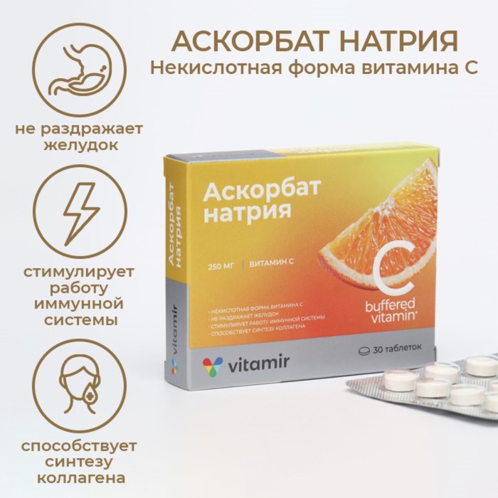 Витамин С, Аскорбат натрия некислотная форма ВИТАМИР, 30 таблеток по 600 мг 3 фото