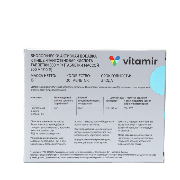 Пантотеновая кислота Витамин В5 ВИТАМИР таб. 500 мг №30 3 фото