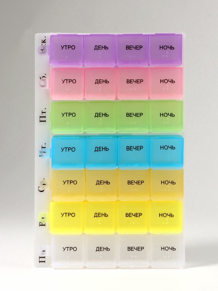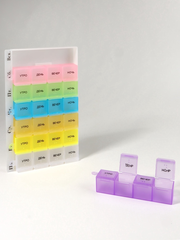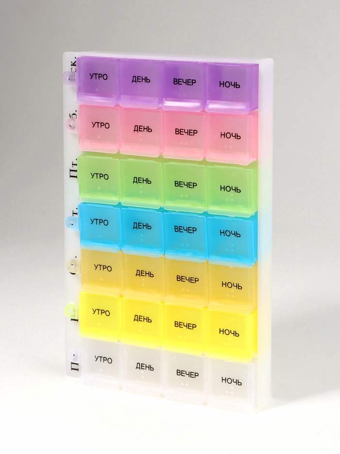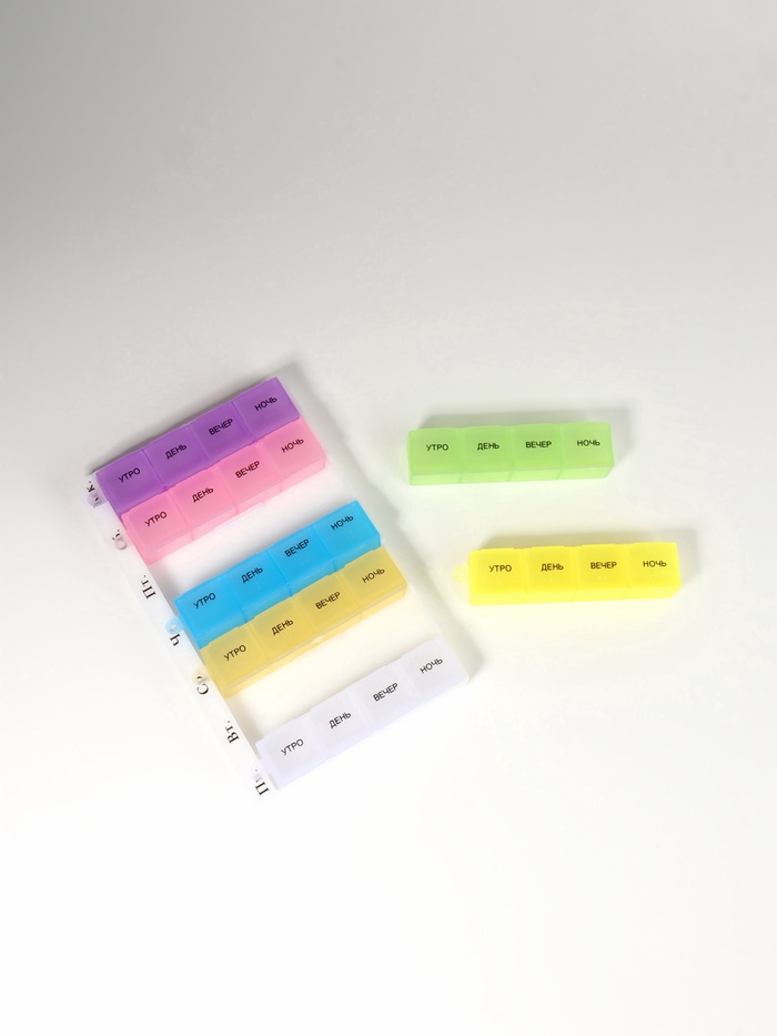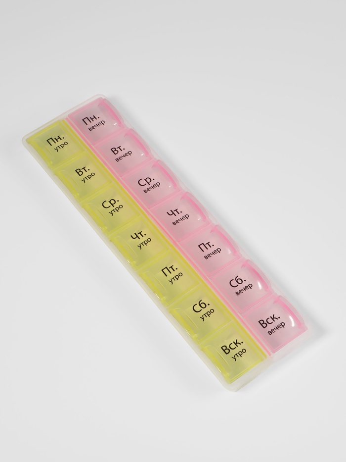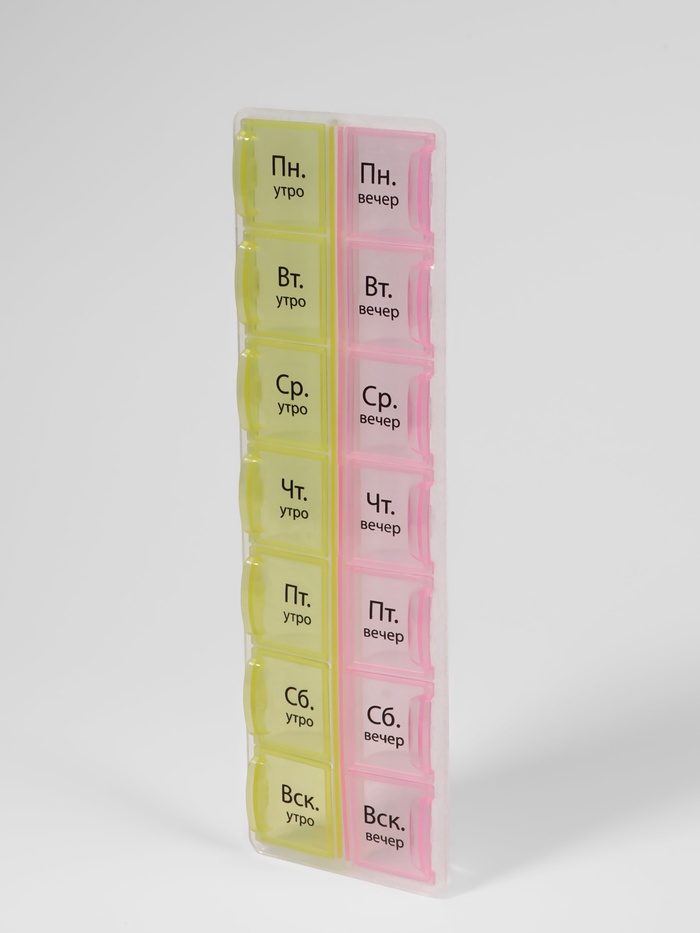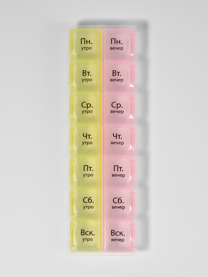 Таблетница - органайзер «Неделька», русские буквы, утро/вечер, 21.5×6.5×2 см, 14 секций, жёлтая, розовая 5 фото