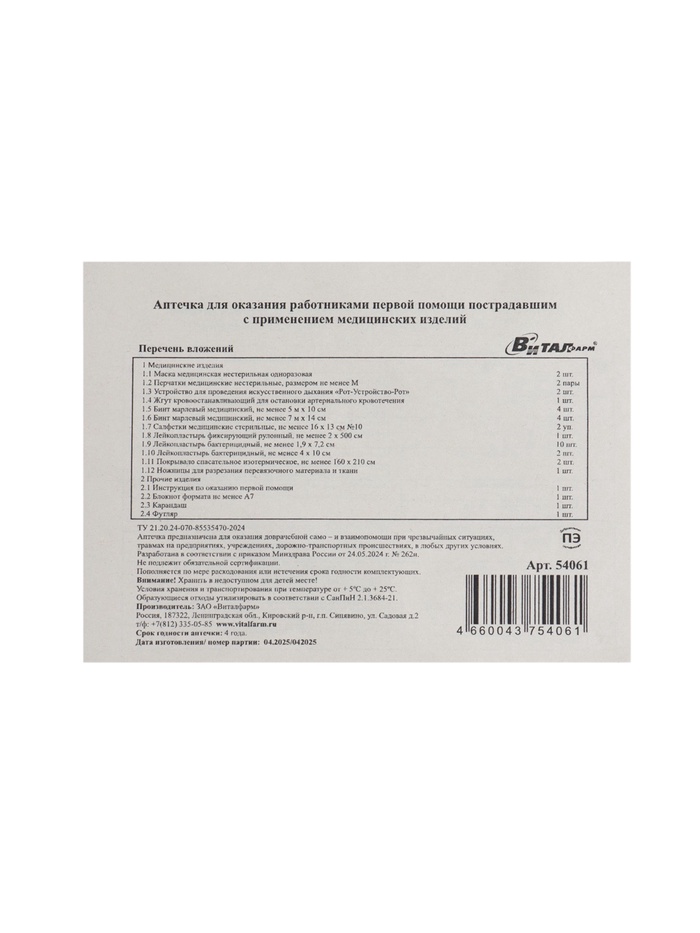 Аптечка для оказания первой помощи работникам Виталфарм, по приказу № 262н, пластик 6 фото