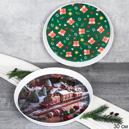 Поднос круглый 30 см набор 2 штуки Зеленый и Поезд / X30 /уп / Новогодний