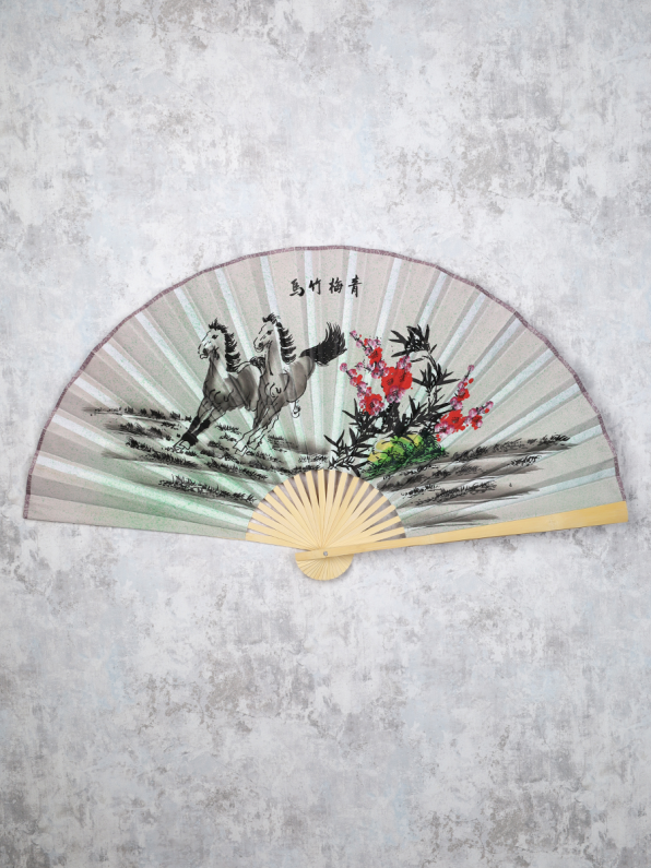 Веер 63 см бамбуковая основа Серо-зеленый с Лошадьми  / 622-12 /уп 75/742905