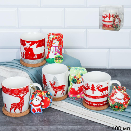 Подарочный набор Кружка новогодняя 400 мл с подставкой под горячее / H012/ в подарочной коробке PVS/АКЦИЯ