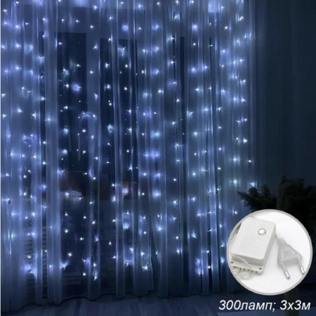 Гирлянда светодиодная Занавес 3х3 м, 300 LED 8 режимов / GN18 /уп 50/ холодный белый
