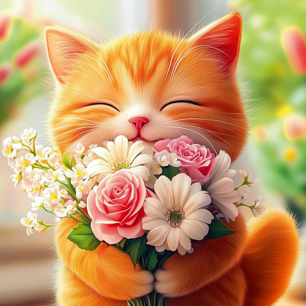 Алмазная мозаика по номерам 30х30 см (НА ПОДРАМНИКЕ) "КОТЕНОК С БУКЕТОМ" Частичная выкладка 71438 Феникс 3 фото