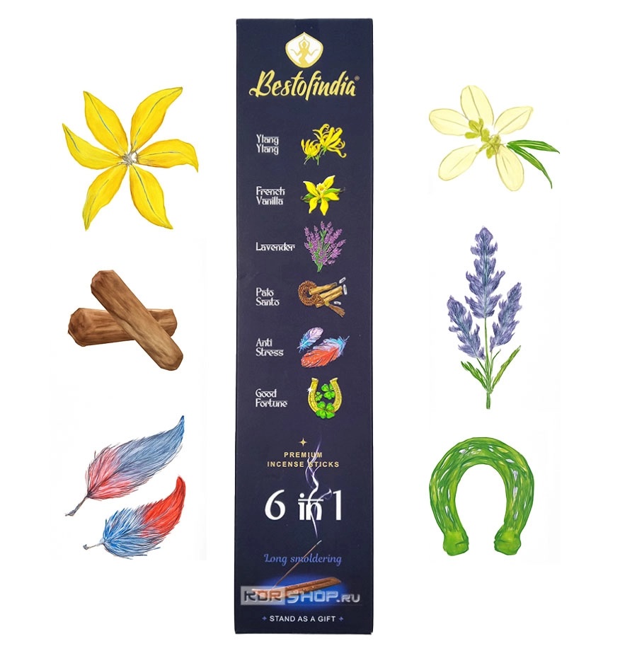 Ароматические палочки 6 в 1 (Иланг Иланг, Французская ваниль, Лаванда, Пало Санто, Анти-стресс, Удача) с подставкой Bestofindia, Индия, 24 шт.