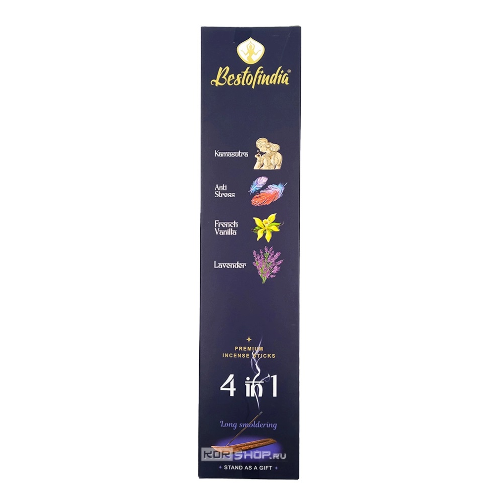Ароматические палочки 4 в 1 (Камасутра, Анти-стресс, Французская ваниль, Лаванда) с подставкой Bestofindia, Индия, 20 шт.