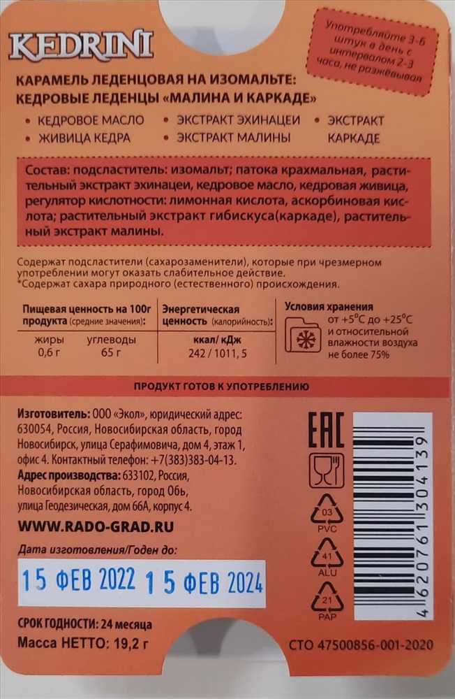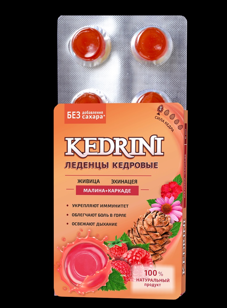 Леденцы кедровые Kedrini малина и каркаде Без сахара  6 шт. блистер 2 фото