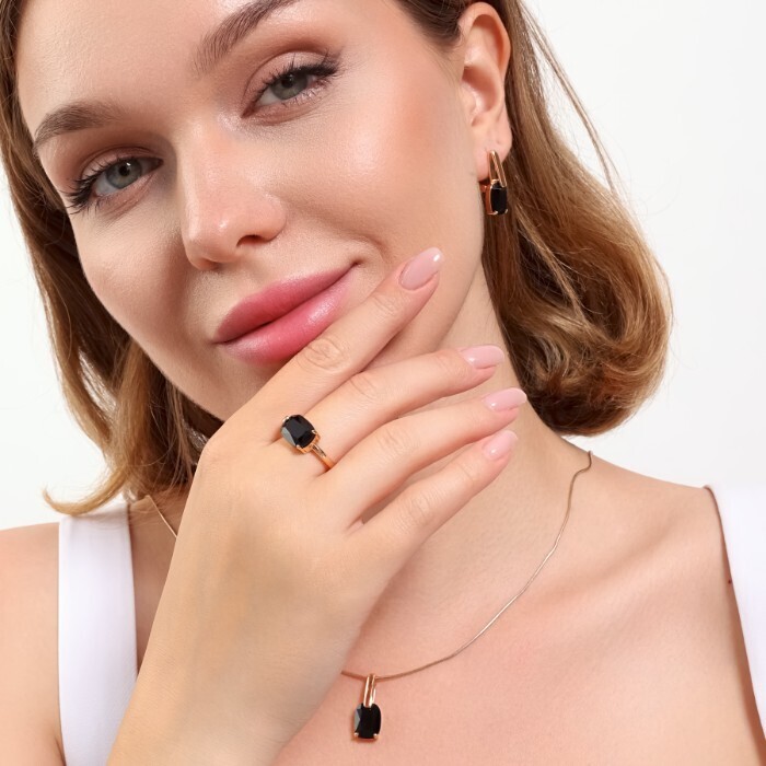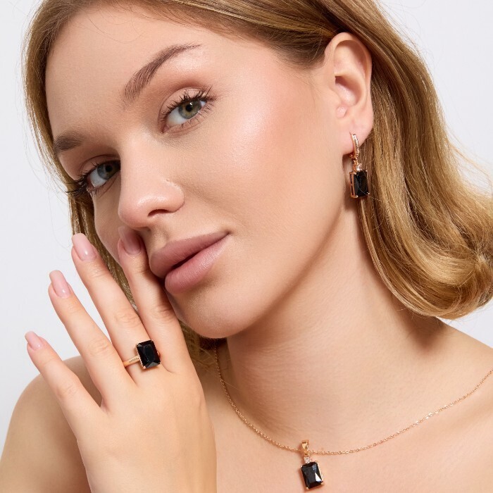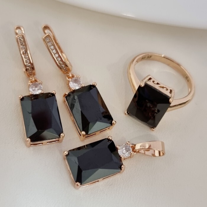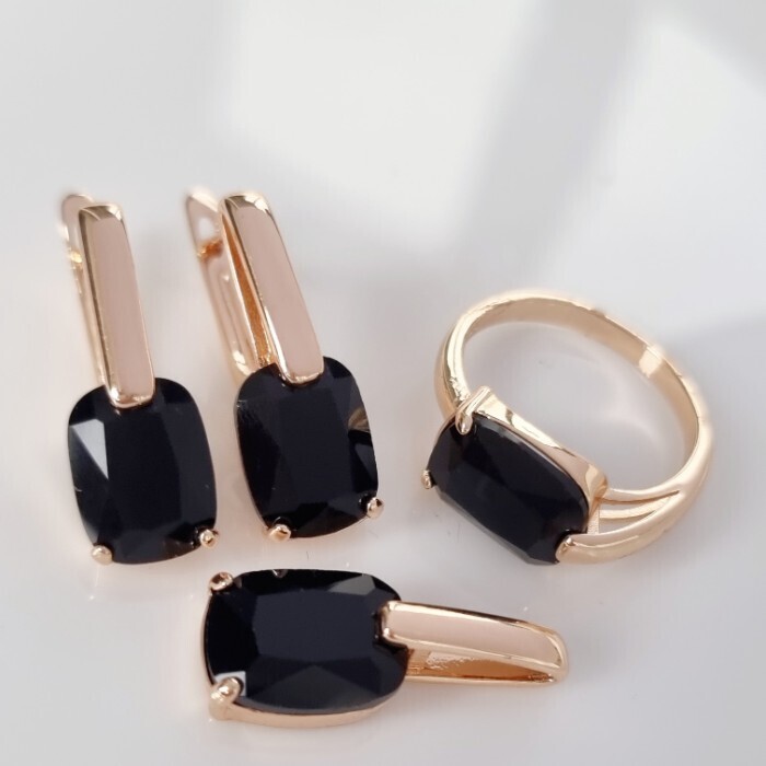 Комплект ювелирной бижутерии коллекция "Дубай" серьги, кулон и кольцо 17 р, покрытие позолота, вставка: фианиты, цвет: черный, Уценка, арт.08.4051-17 (215.385-17) 2 фото