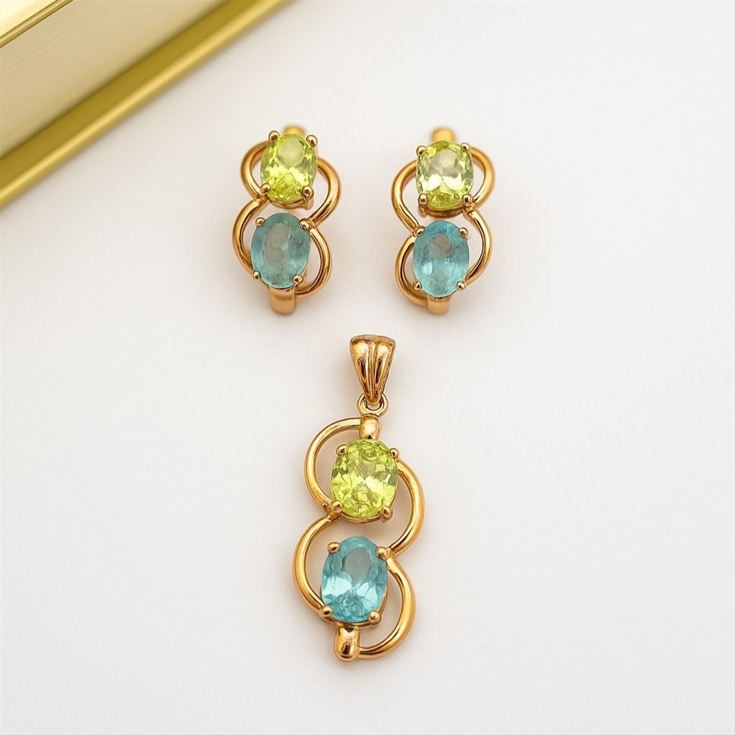 Комплект ювелирная бижутерия коллекция "Xuping" серьги и кулон, покрытие позолота, вставка: фианиты, цвет: голубой и зеленый, арт.007.208